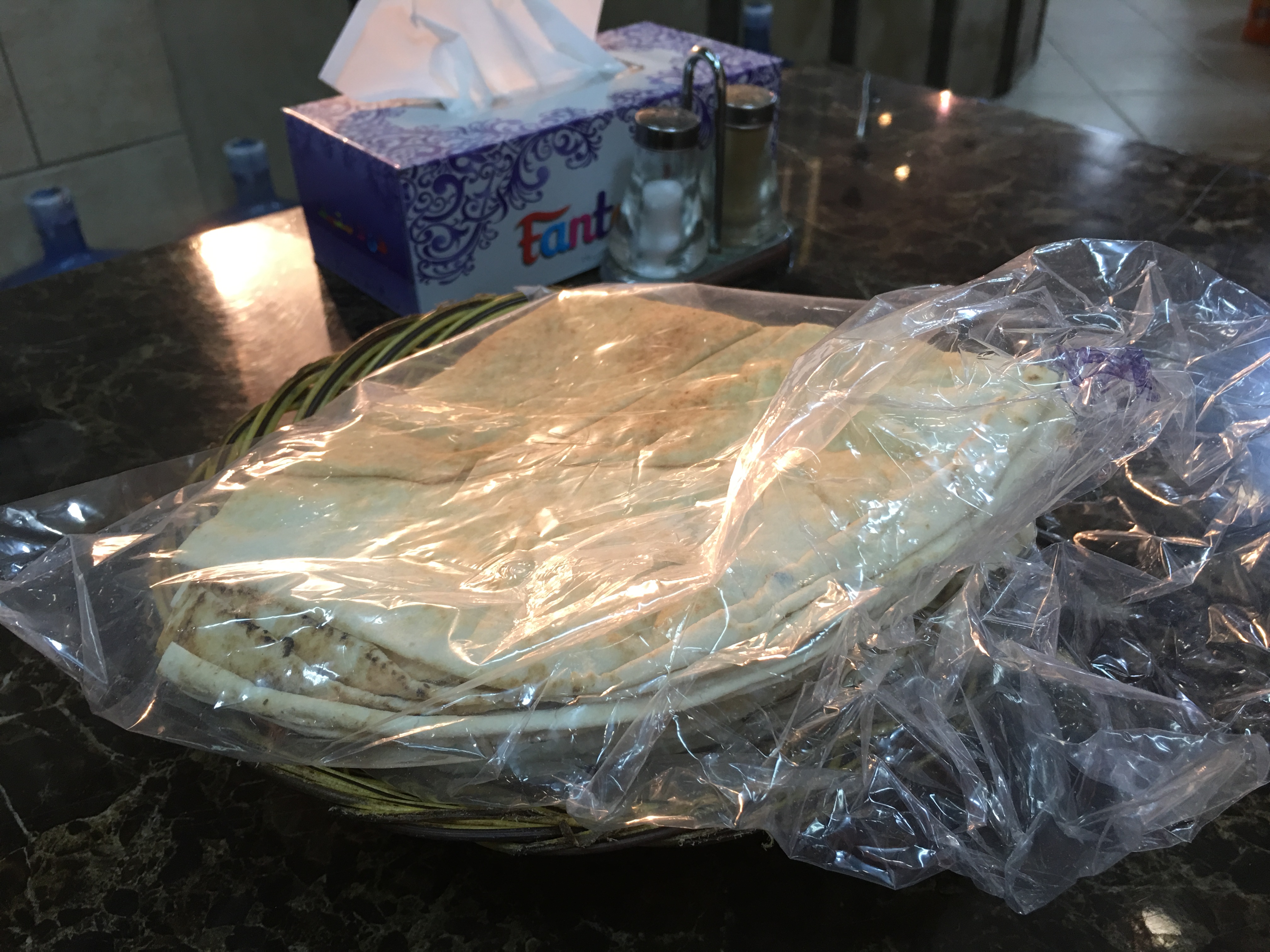 每桌上一盘阿拉伯大饼,点餐的话还给你按人头瓶装水