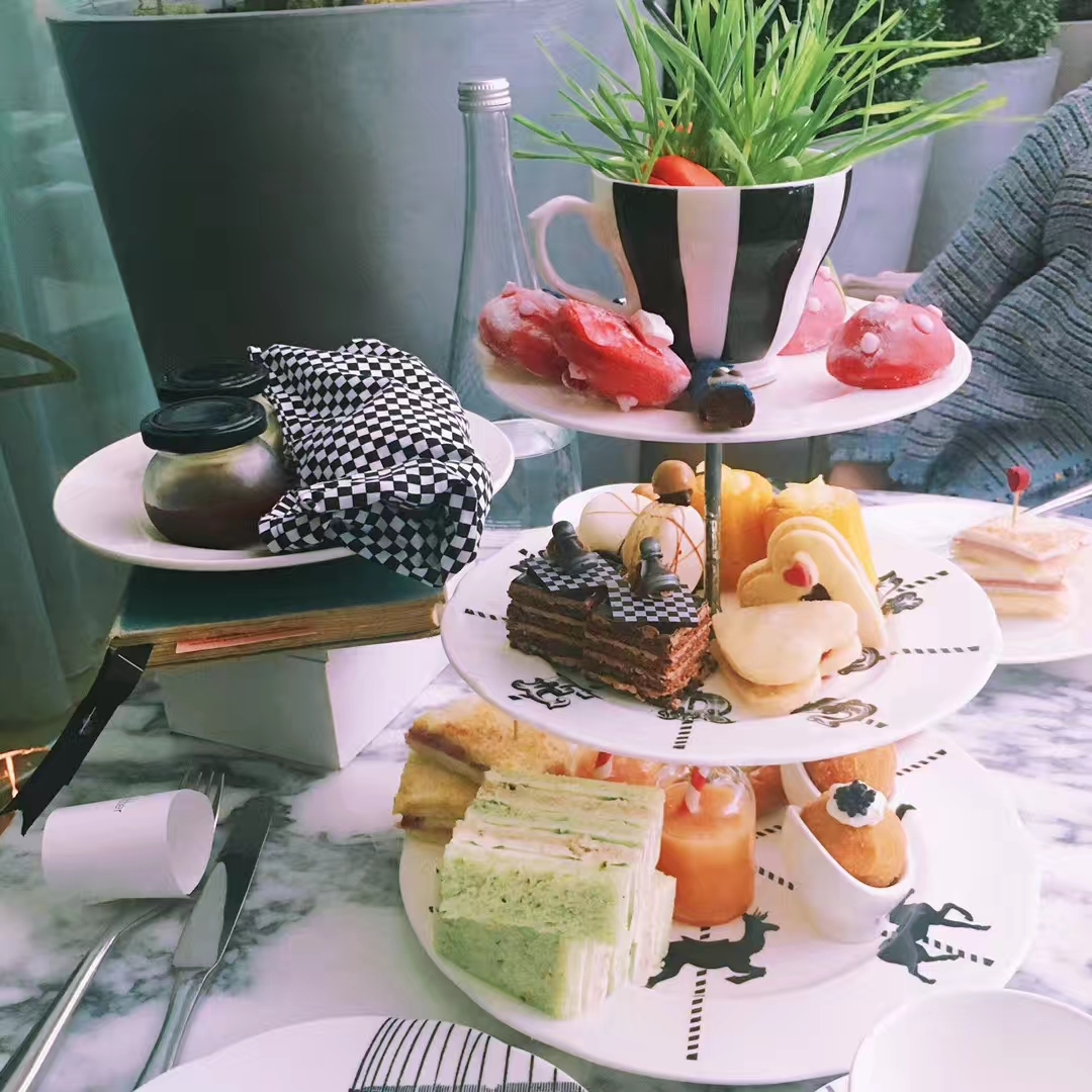 ↓Mad hatter 爱丽丝主题下午茶↓超级超级超级可爱和独特!黑白棋盘格和条纹餐具简约干净,但茶点又是粉粉橙橙小桃心,对比起来赏心悦目。在这家下午茶我学会了卡仕达配司康这种非常长肉但又欲罢不能的吃法哈哈哈