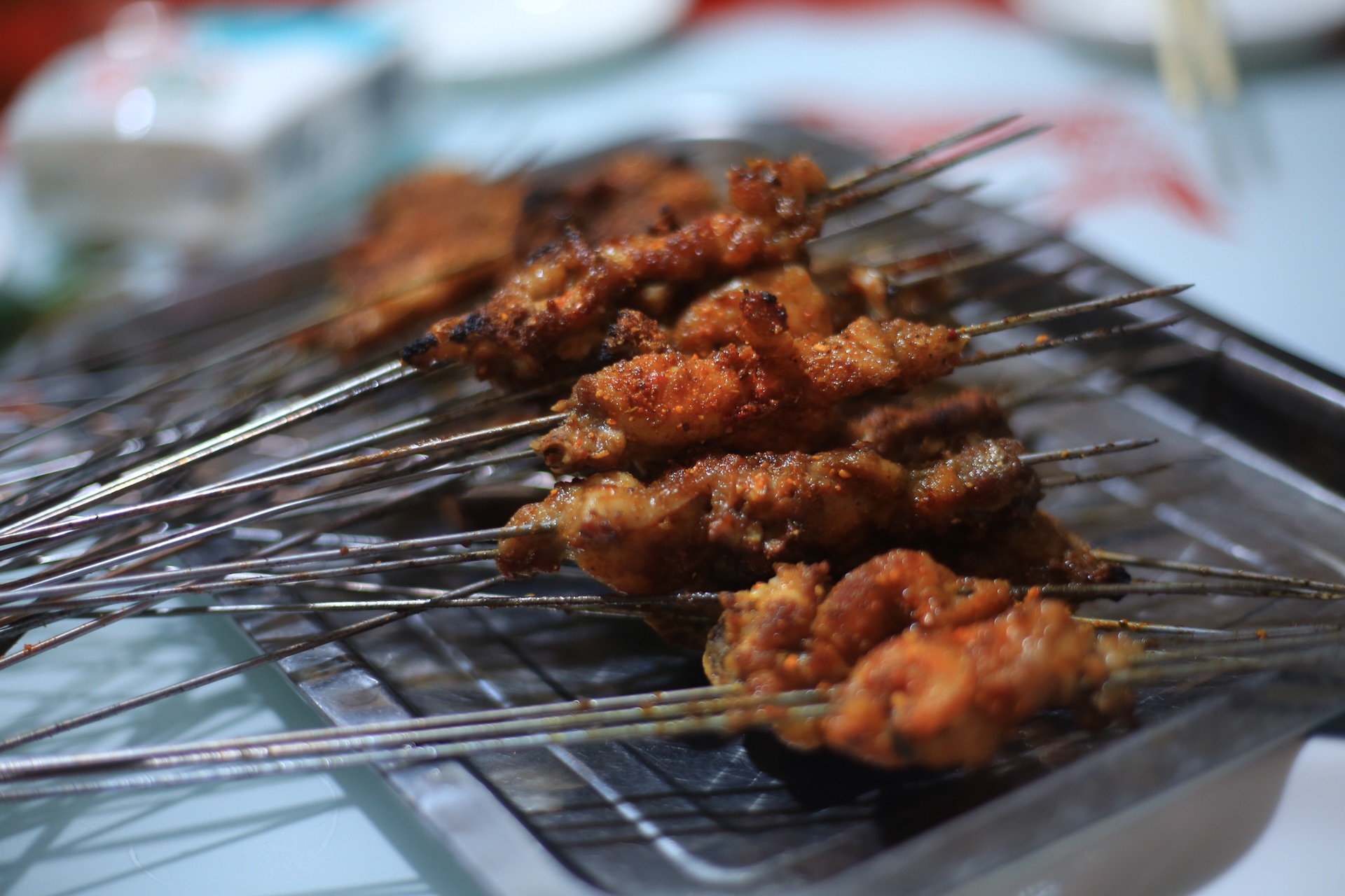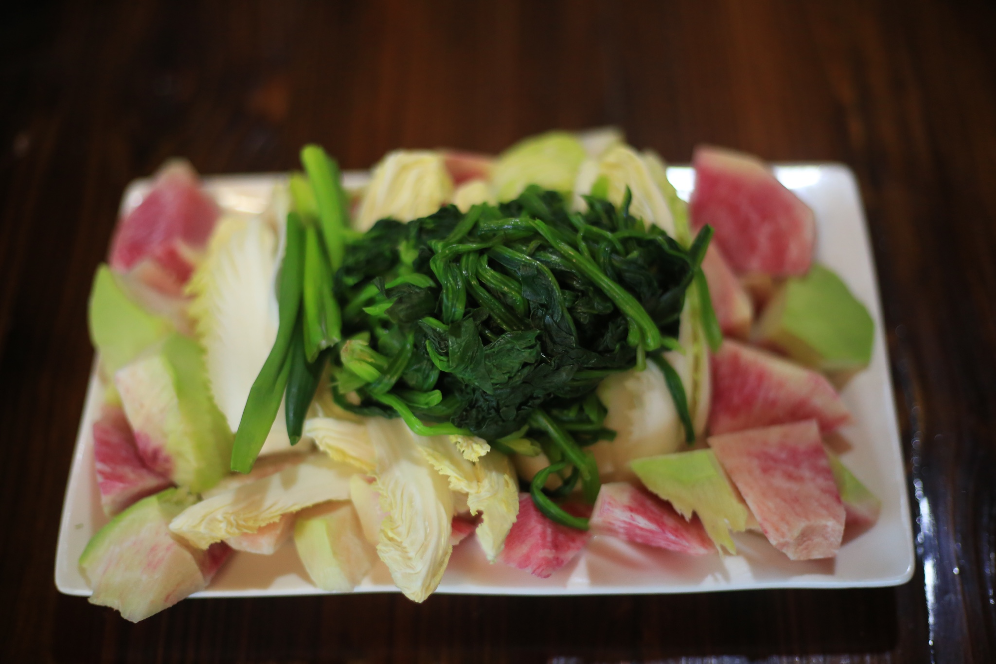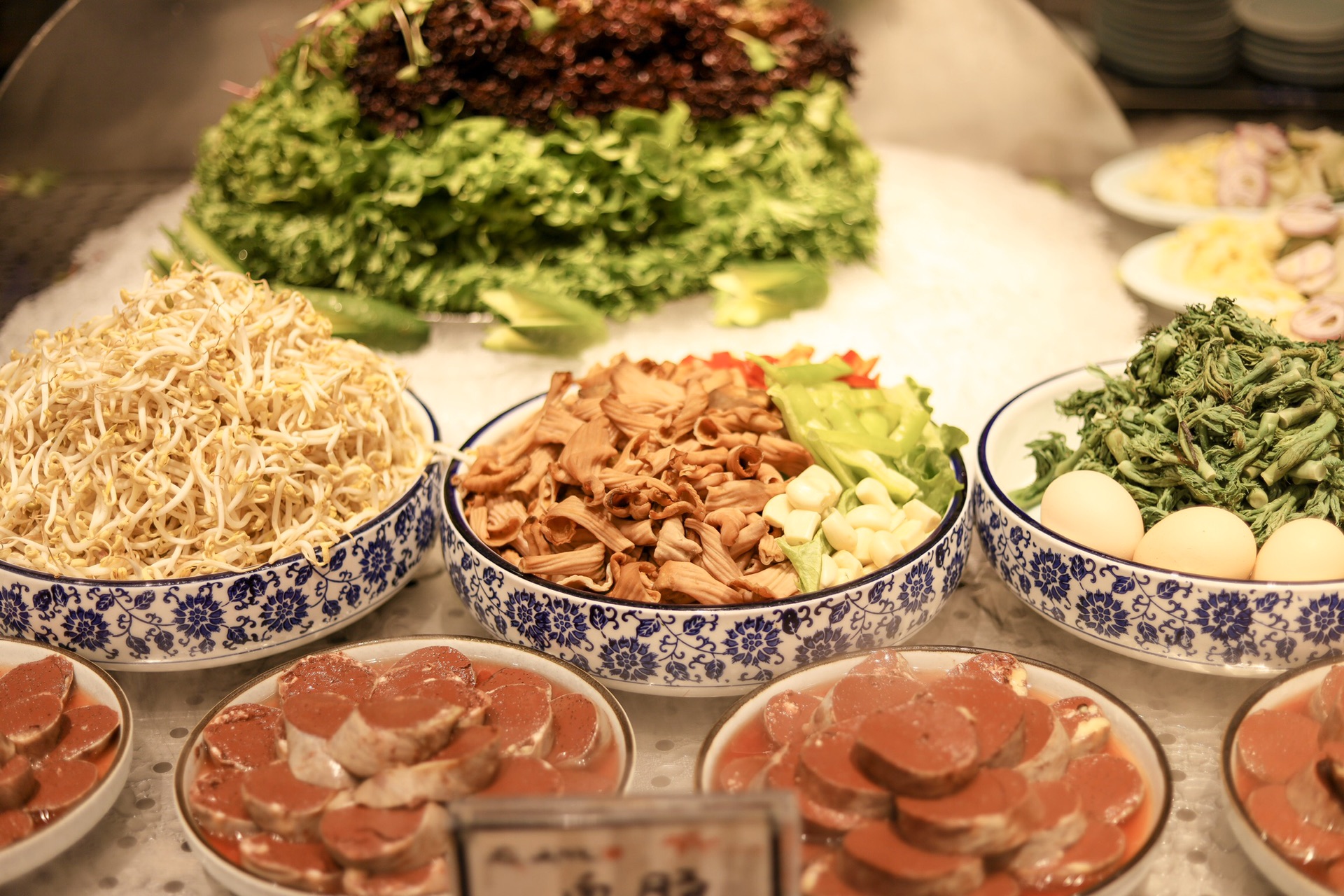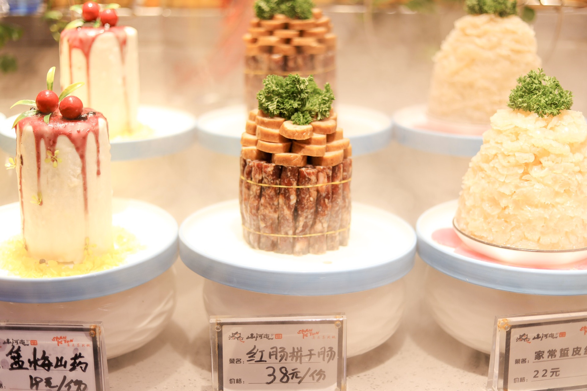 山河屯铁锅炖门口摆放着各类菜品,看着就口水直馋,仙雾缭绕中特别有食欲。