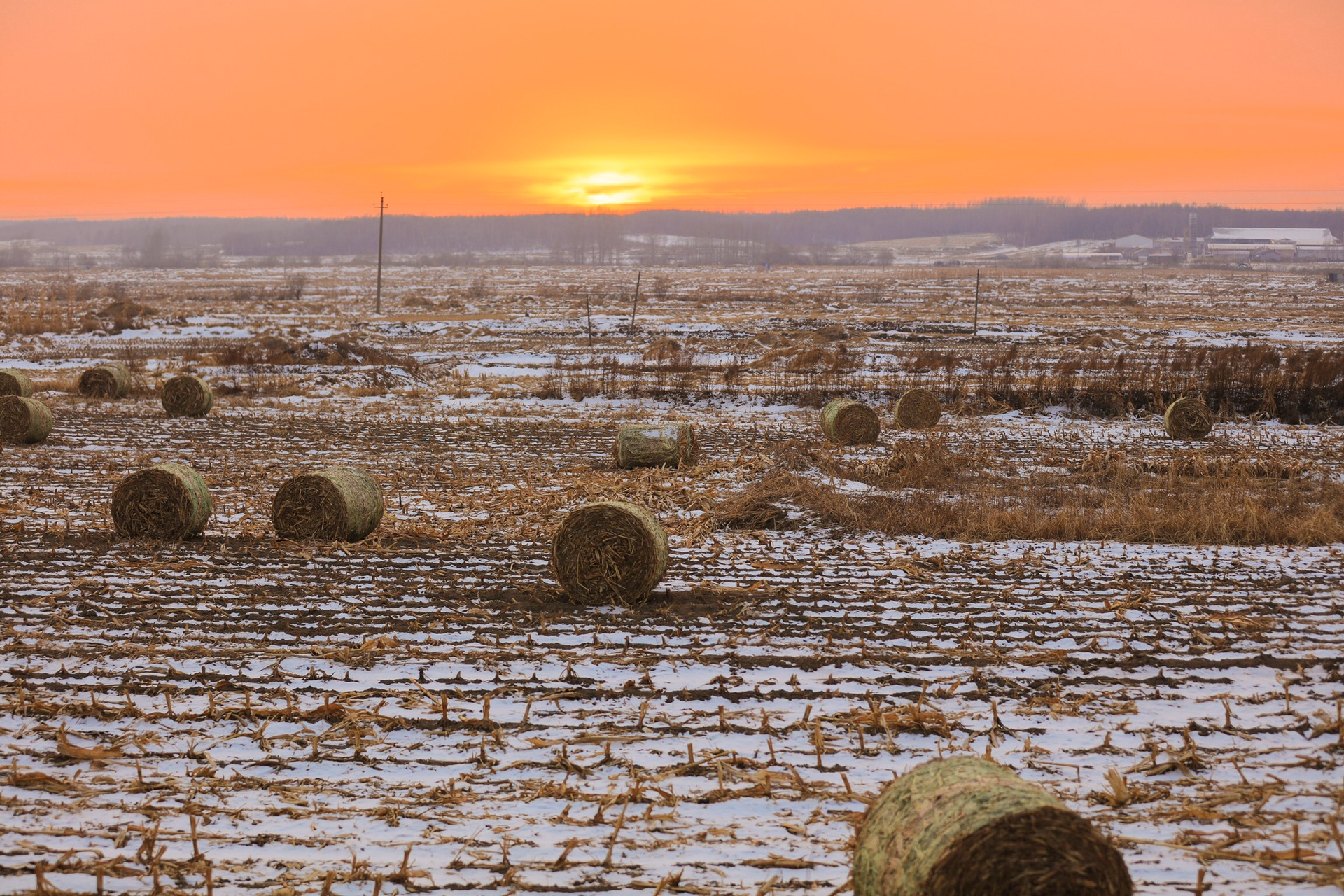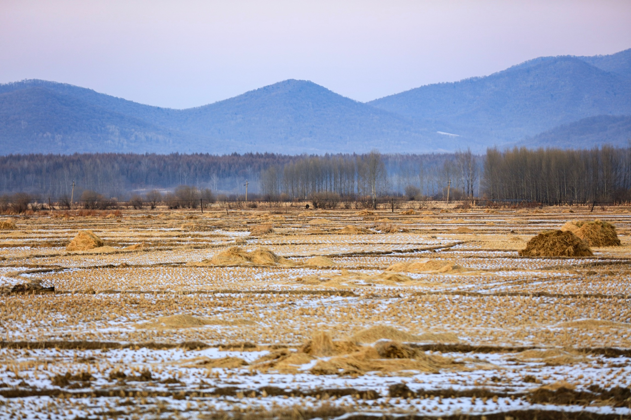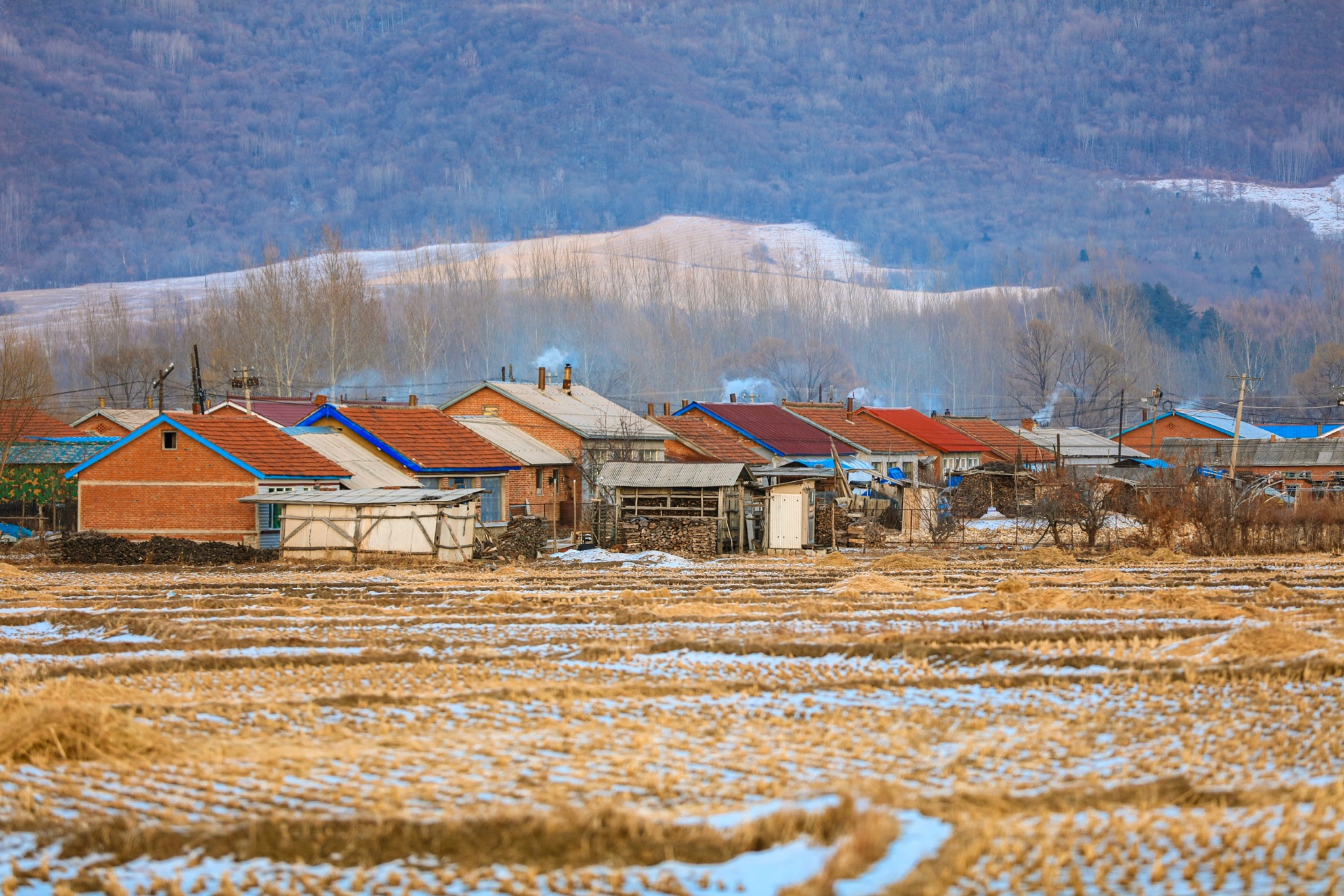雪谷遇上金黄麦田,耕种的老伯与彩色房屋