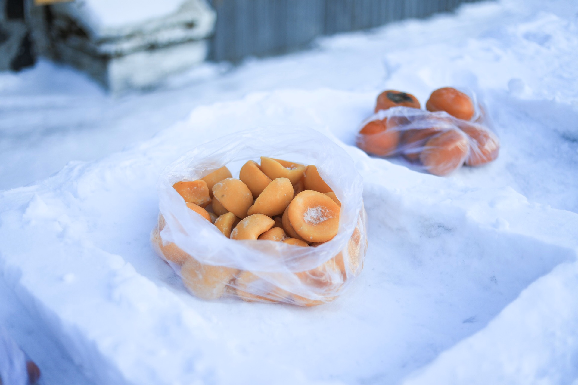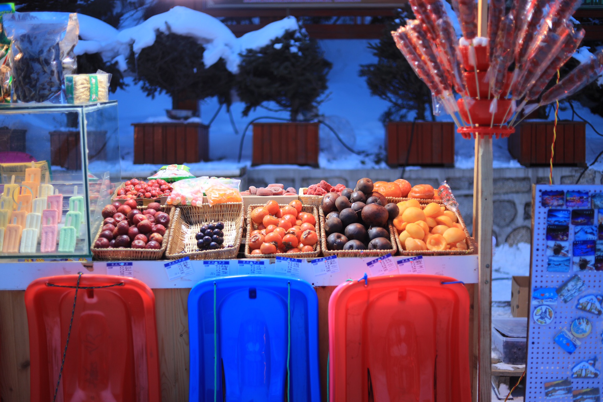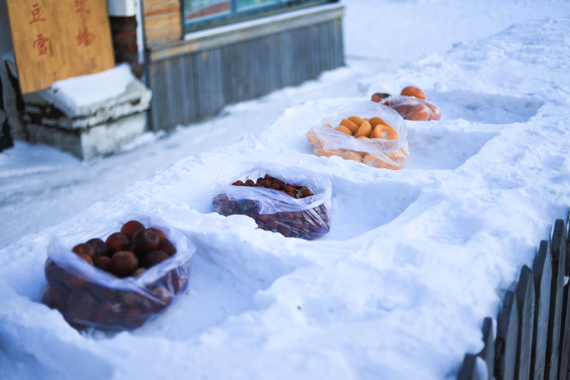 雪谷桌上中间的是冻柿子,来北方必须体验的天然冰箱,解冻后冰爽可口