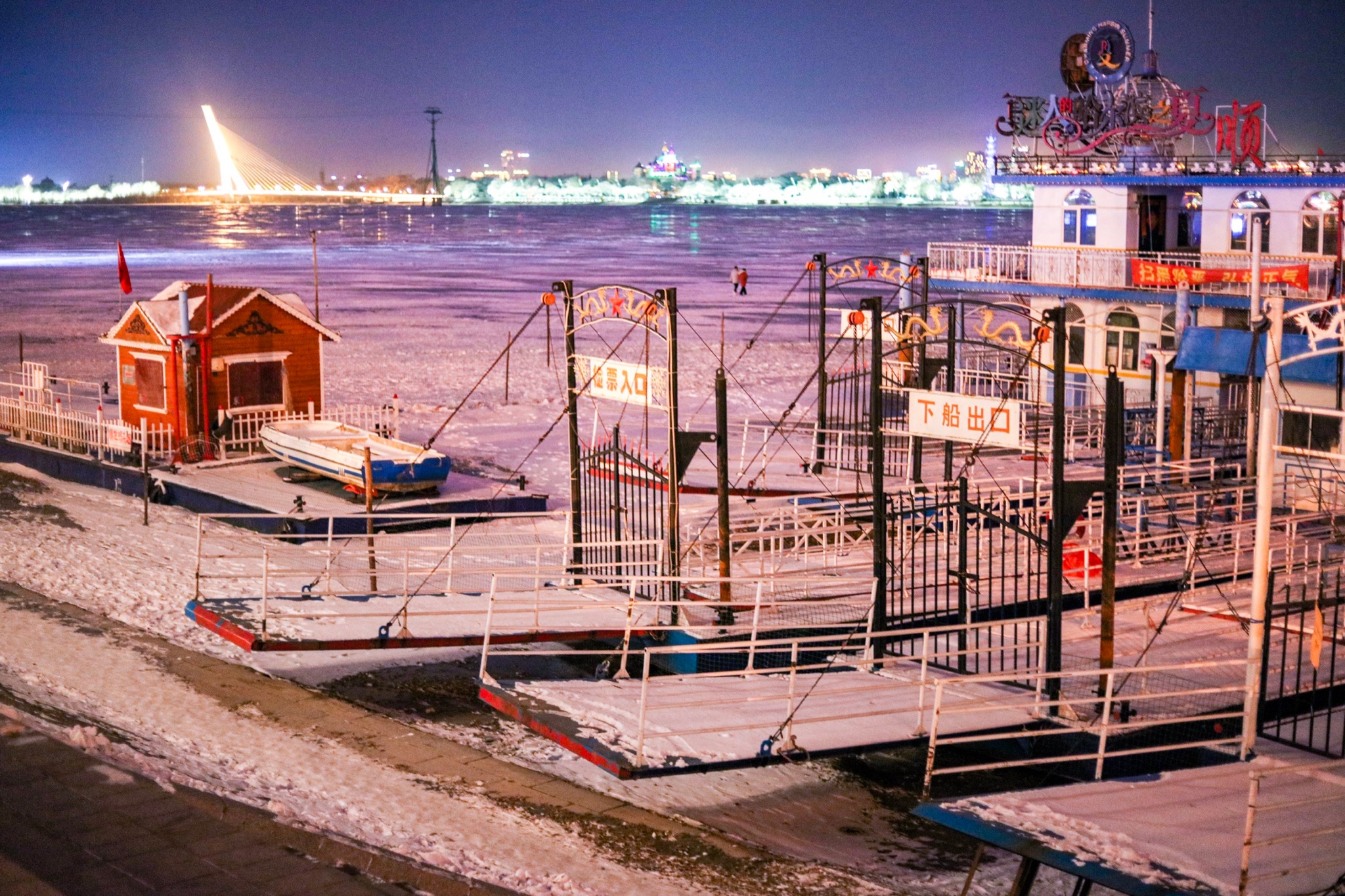 松花江冰冻的湖面冻住了所有游轮,从船底到船顶都结上了厚厚的冰霜。再往前走,便是松花江铁路大桥,这座曾联通欧陆的老江桥,是整个城市兴衰荣辱最坚定的见证者。