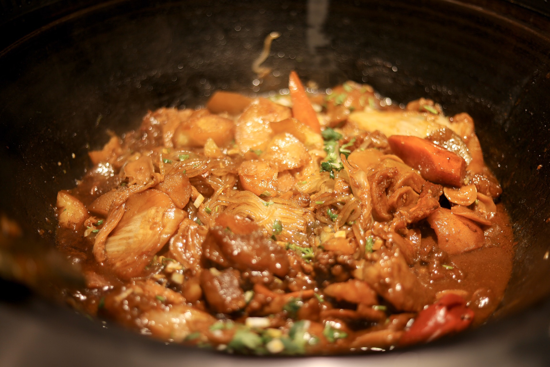 山河屯铁锅炖把选好的食材一起炖上,揭盖还有祝福语,用热锅的蒸汽顺路蒸上馒头花卷,沾着锅内的酱料吃简直不要太美味