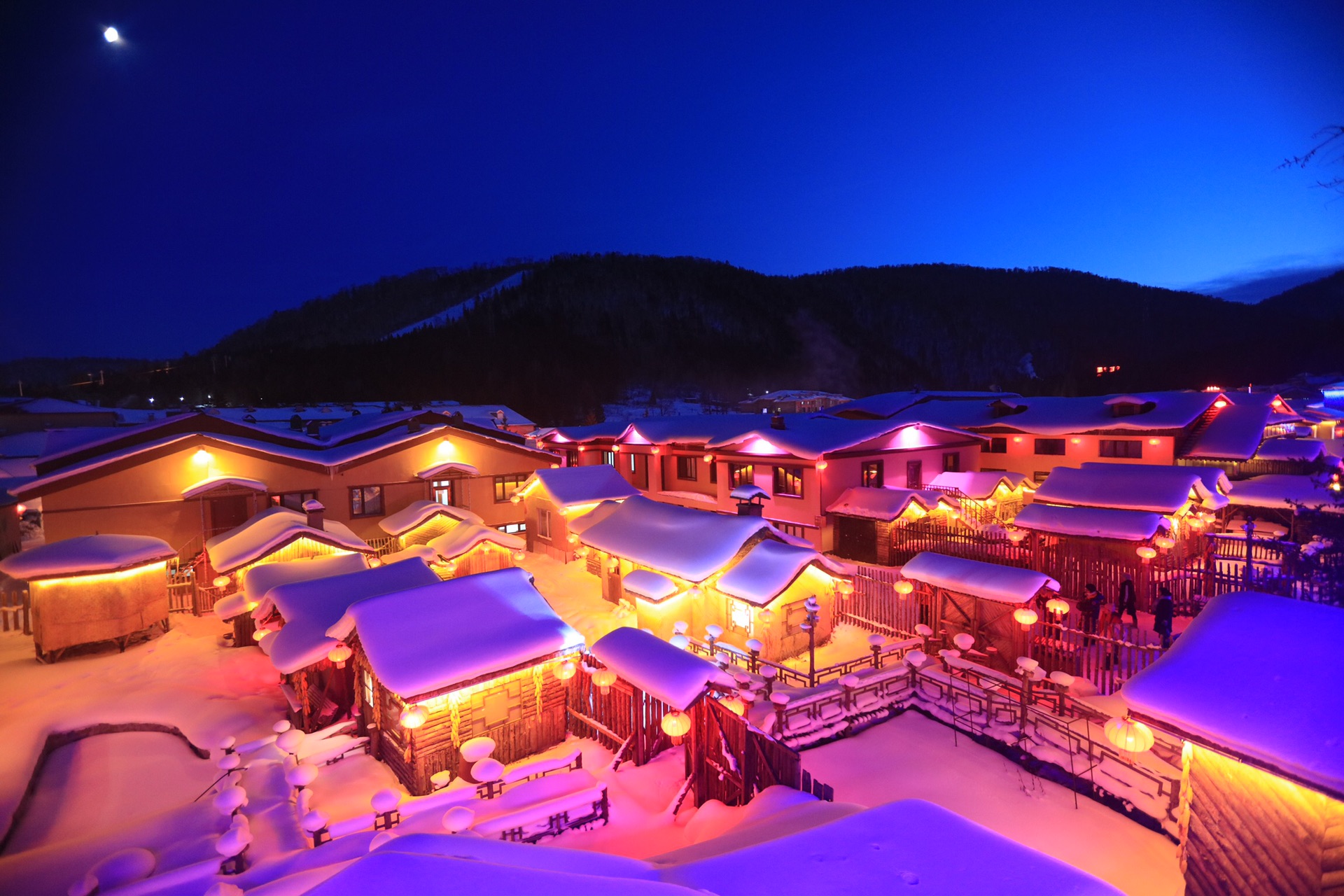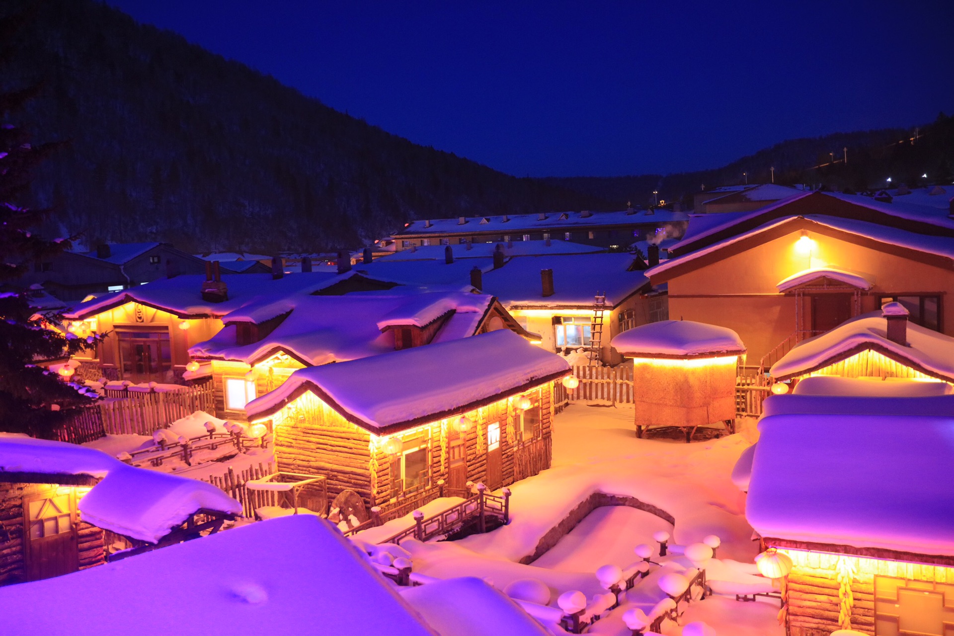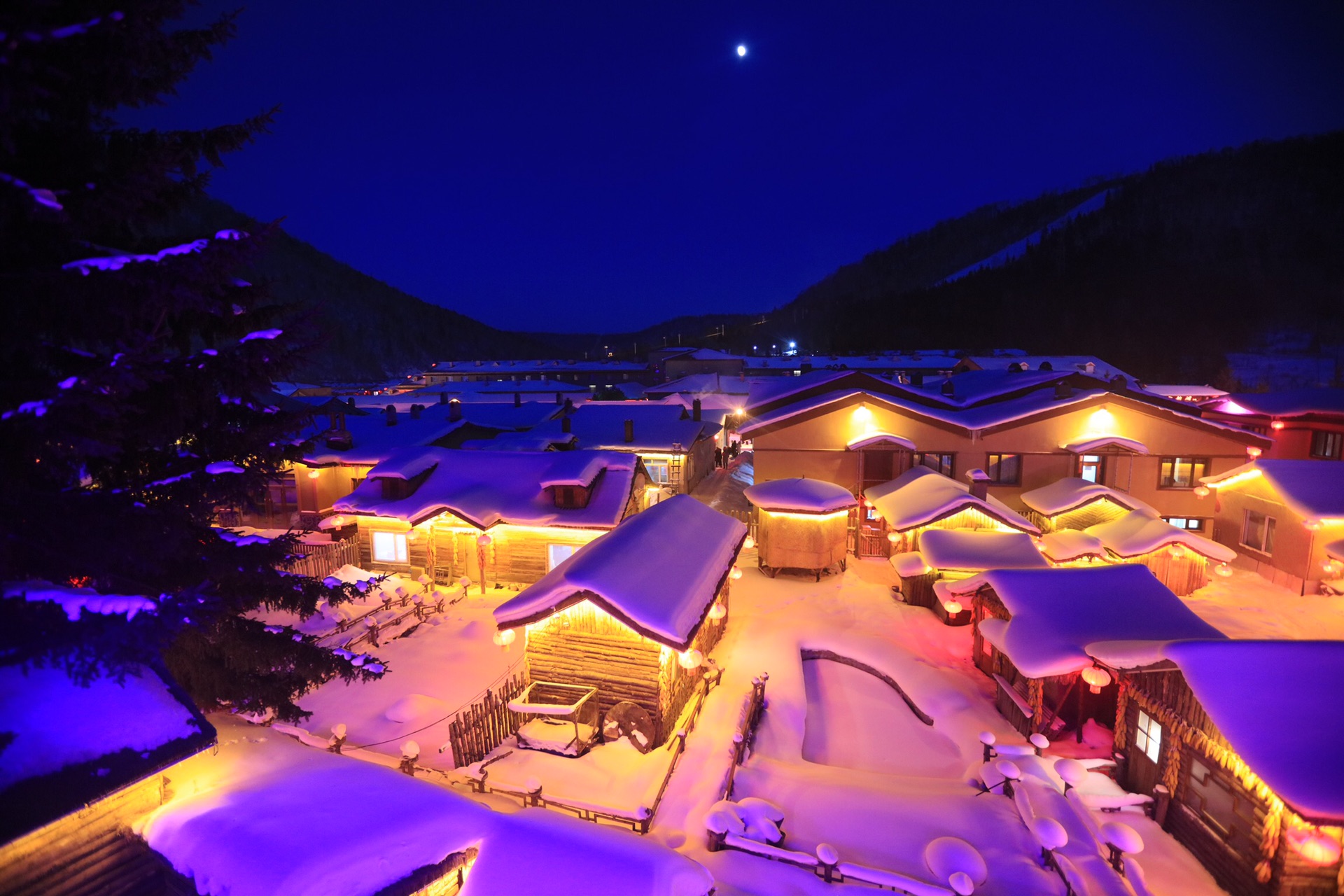 雪乡国家森林公园-中国雪乡风景区爬上栈道,童话世界在眼前亮起,积雪在房顶堆成千层屋檐,传说中的雪蘑菇大片又大片呈现在眼前,高高矮矮的童话村庄亮起暖黄色灯光,彼时月光柔美,内心照得祥和。