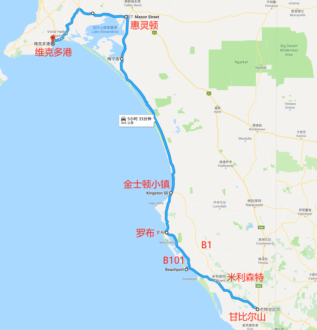 甘比尔山到维克多港会有两条路可选,一条是内陆的A66和A8公路,一条是沿海的B1和B101公路。如果喜欢小镇风情,那么可以选择内陆的公路,会经过几个不错的风情小镇。而沿海的公路就是南澳粗犷的自然风光,潟湖、盐碱地、盐湖与牧场等等。经过米利森特记得走B101公路,在金士顿小镇享受著名的龙虾大餐之后再上B1公路。