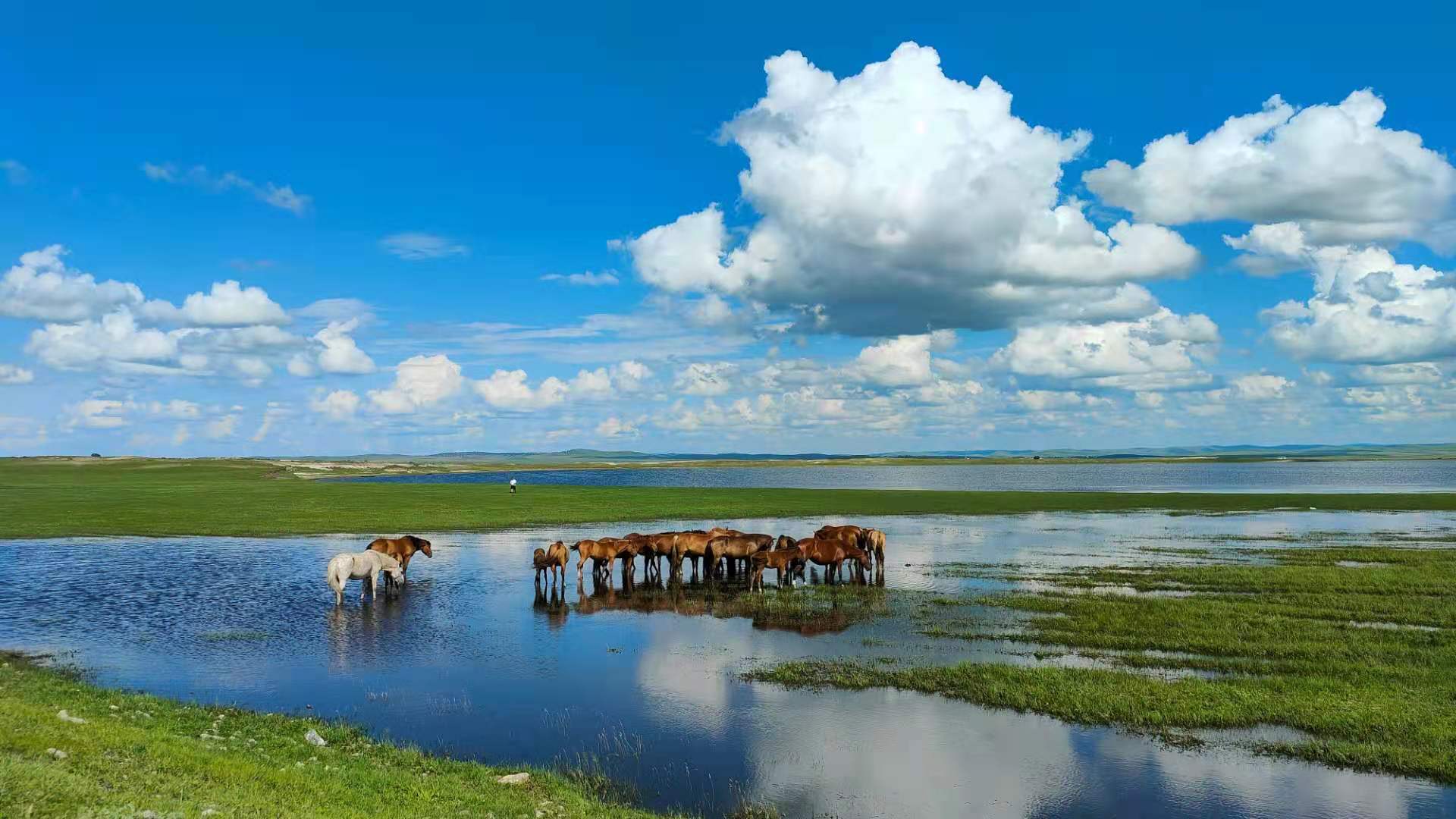 草原是世界四大草原之一,被称为世界上最好的草原。在这片地...更多>草原的风在每一个不同的季节都别有一番不同的风韵。六月是草原最美丽的季节,也是最让人心旷神怡的,它不像冬天的风那么刺骨,更不像秋天的风那么干燥;它美丽,在于它吹绿了万物,吹开了野花,深深的草丛在微风中摇曳,是那么的婀娜,充满了神韵;它轻柔,它游过深深的湖水,掀起了阵阵微波,在阳光的照耀下闪烁着银光,碧水印着蓝天,蓝天衬着碧水,那种天连水来水连天的画面,宛如在天镜中遨游,自在、奔放
