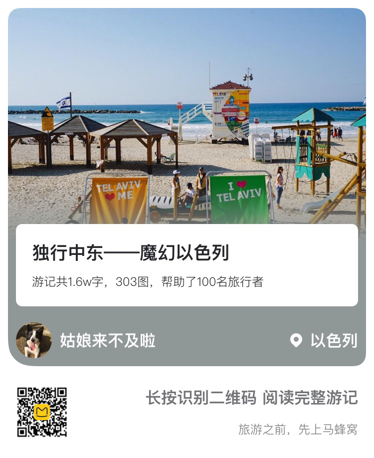 我爱好历史,所以对以色列很有好感,短短几天看不够。去之前也看书学习他们的历史,因为特别是罗马帝国奴役犹太人之前那一段了解得太少,不希望到了那里脑子依旧是一片茫然。而且在耶路撒冷两天我还请了中文导游,价格高也是值得的。非常佩服历经千年苦难却坚韧不拔的犹太人,只用了一个多世纪的时间,他们从世界各地...显示全部