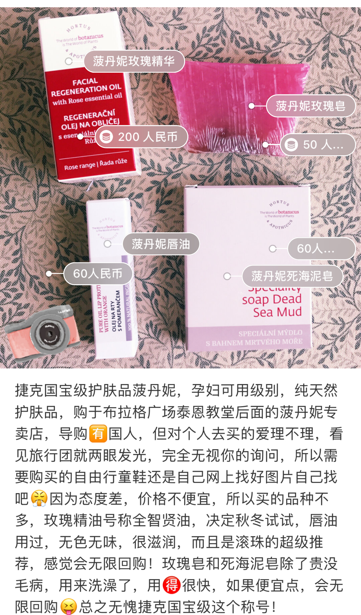 捷克最值得买的一个当地的护肤品Hortus&Apothicus,特别便宜,就在老城广场后面,走过去大概3分钟。他家的洗脸皂,面膜,玫瑰精油都是明星产品!可以自用也可以送人。很经济实惠。还可以退税,但是好像是要买200多捷克币以上才可以,但是一定买得到的。========== 如果你觉...显示全部