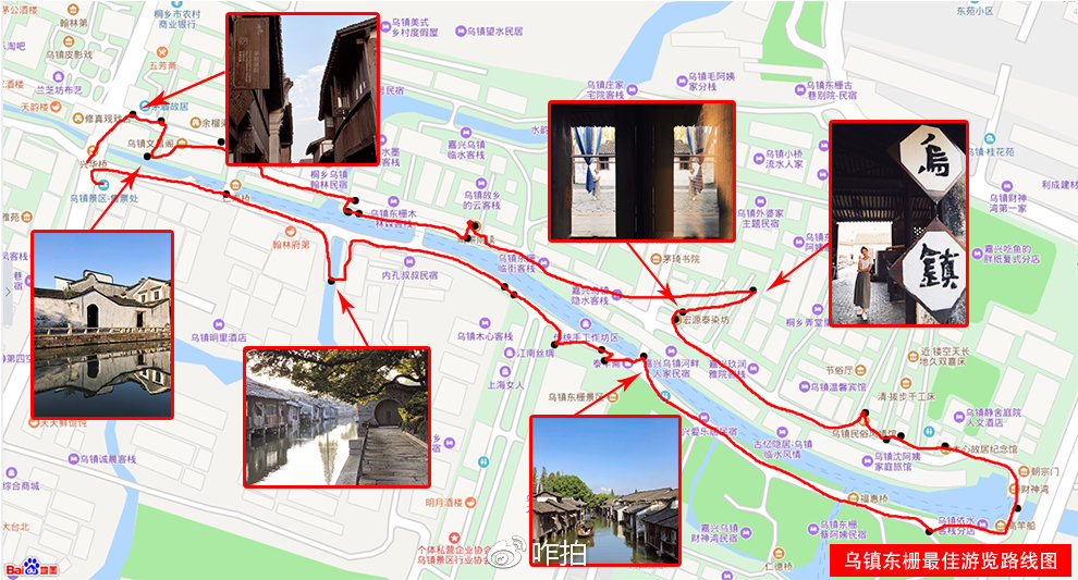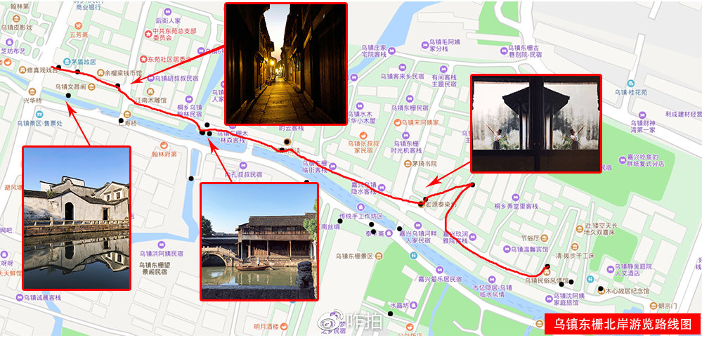 东栅很小,被河水分成了南岸和北岸,围着河岸游览一圈约2个小时。小编给大家整理的路线图是一个圈,可以按照实际情况选择入口,对游览基本没有影响。