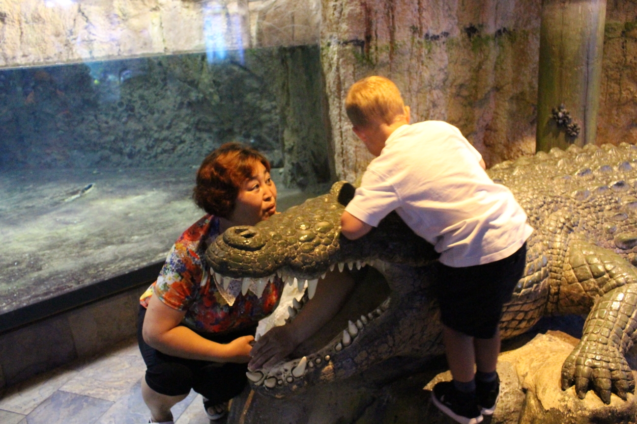 这是迪拜mall的水族馆内,原本要在鳄鱼旁给她拍照,她看到一个落单的小男孩立马就扑了上去各种逗娃,小朋友高冷得很,没有理睬她,我趁机拍照记录下来