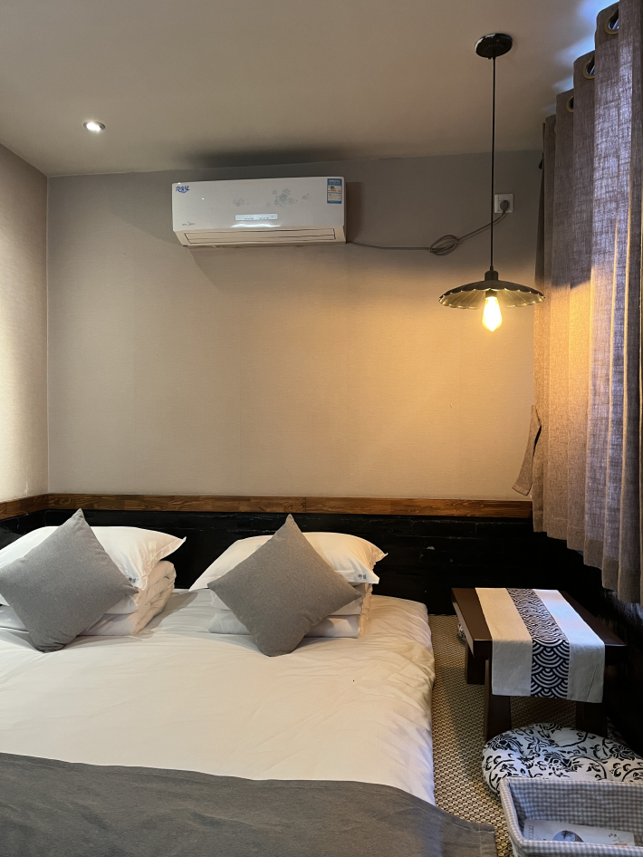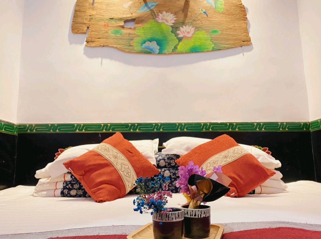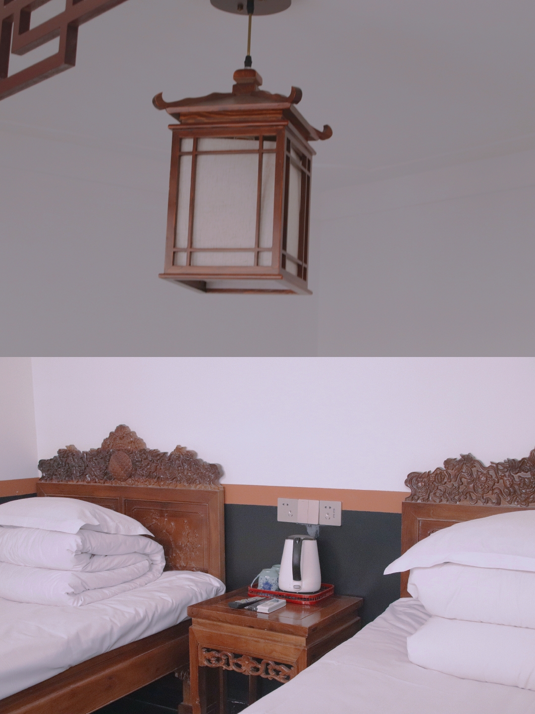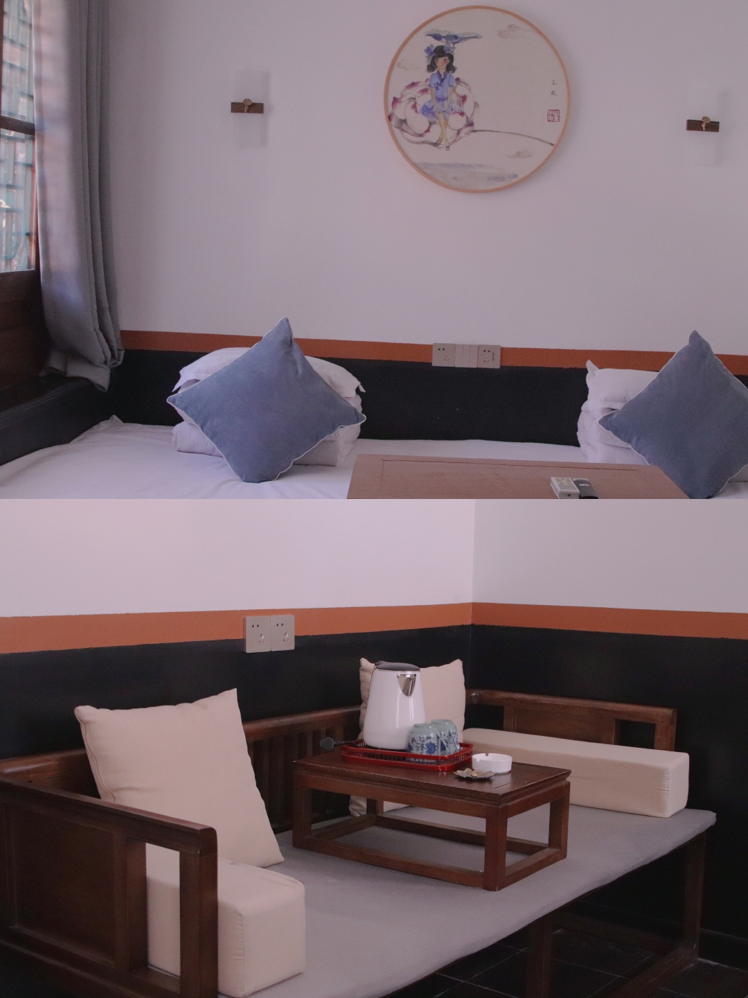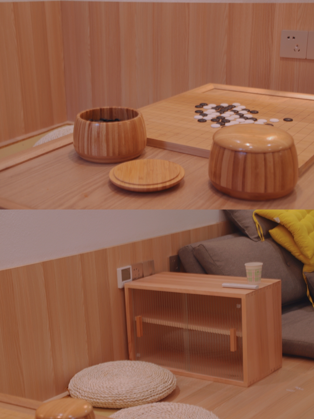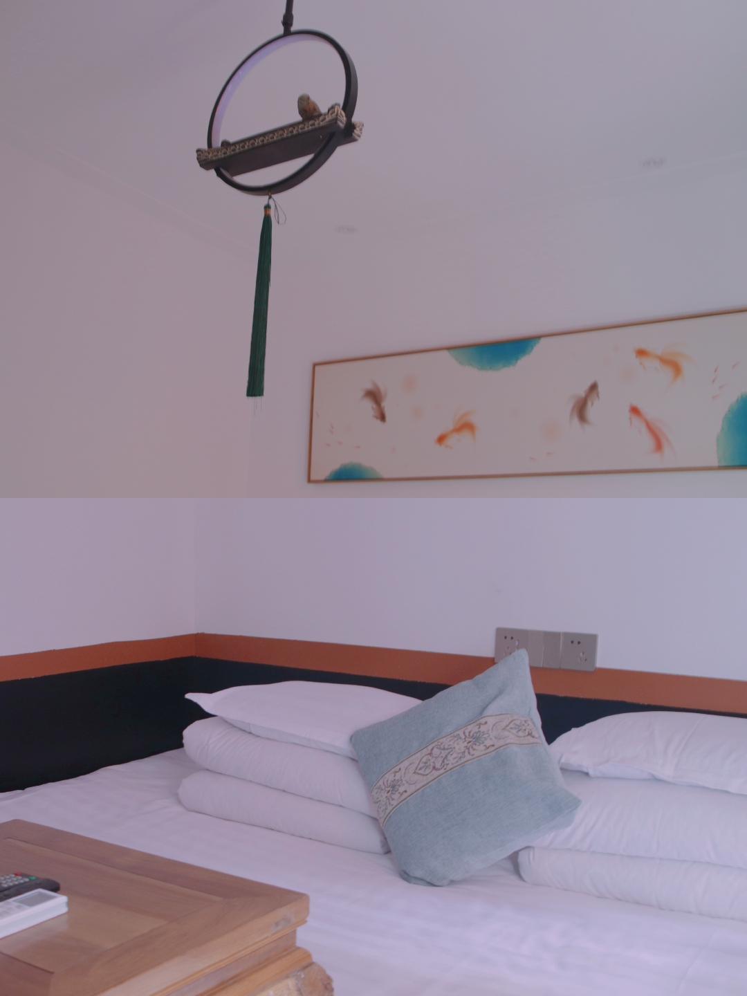 🔹 他们家最有特点的还是房间的内部陈设🖼️🔹 我最最喜欢的就是一进院子左手边那间✨,感觉延续了会客厅的日式风,结合了西北风格,门帘是山西农村常见的大红花布,进去之后是榻榻米类型的,里面几乎是全木制的,有放着棋盘⚪⚫,闲暇时刻可以下会儿棋。 睡的地方放了一个大的懒人沙发那样的东西,对面是悬挂电视📺,在外头逛累了可以把这边当成一个小的家庭影院来看。 卫生间的洗脸盆也是那种编制的,水龙头虽然是铁质的,但做的就像竹子的样式,两者结合起来真的很高级💫 💡整个房间的灯源是暖黄色的,开灯之后整个房间就显得很温馨,我能在里面呆上一天