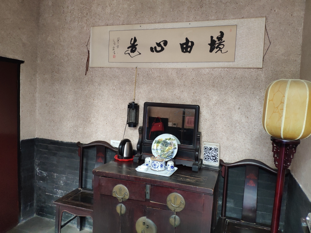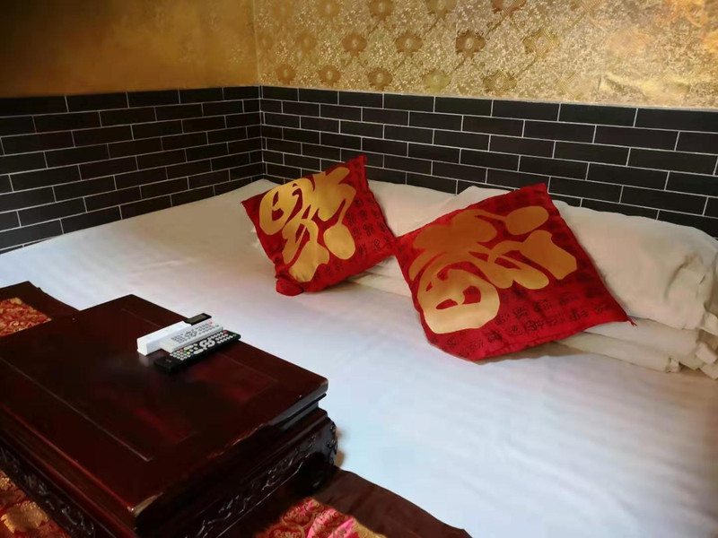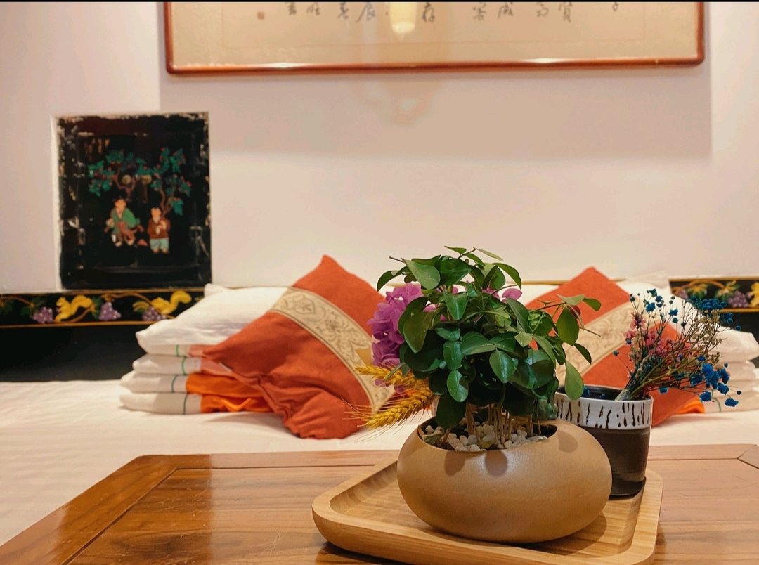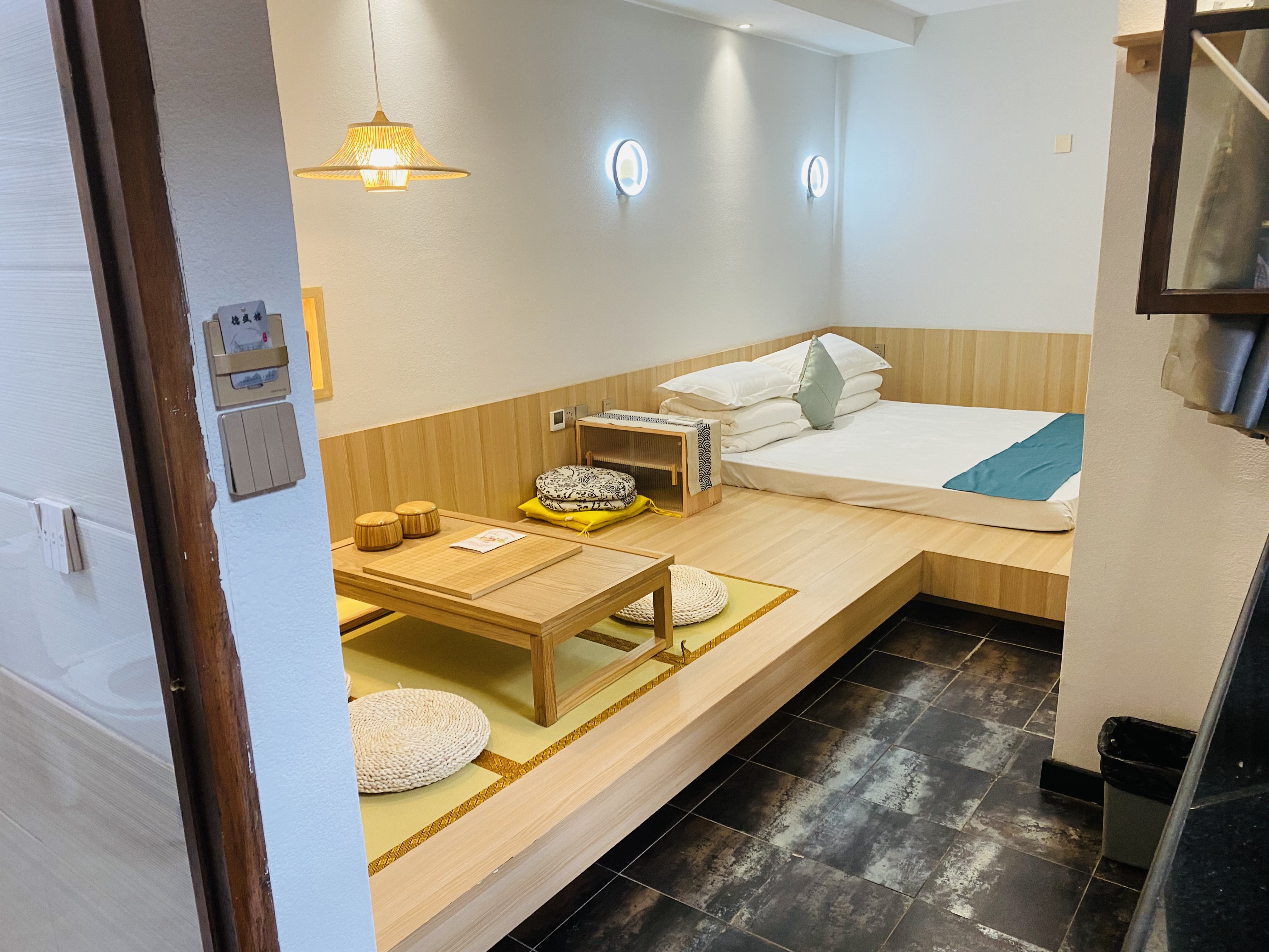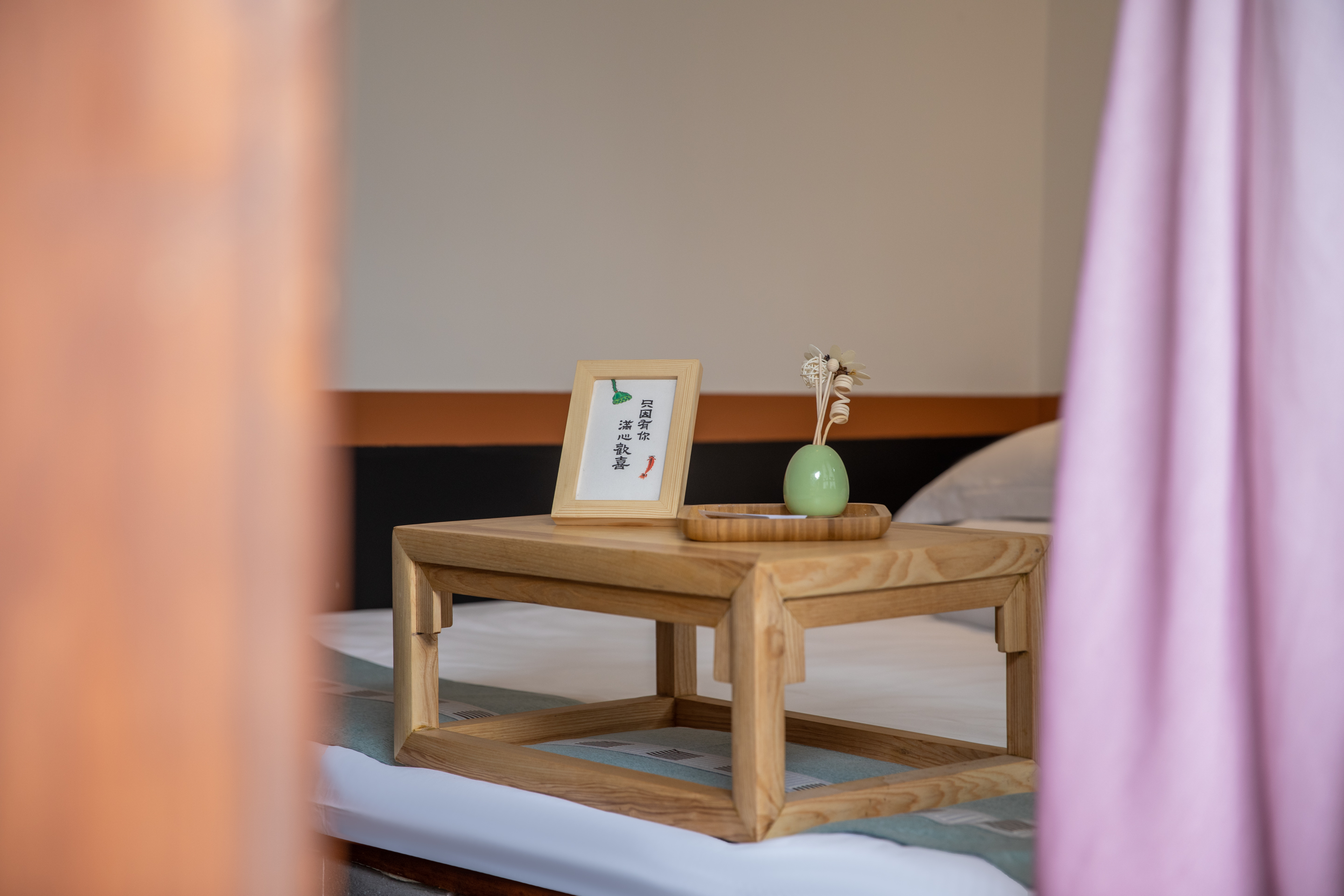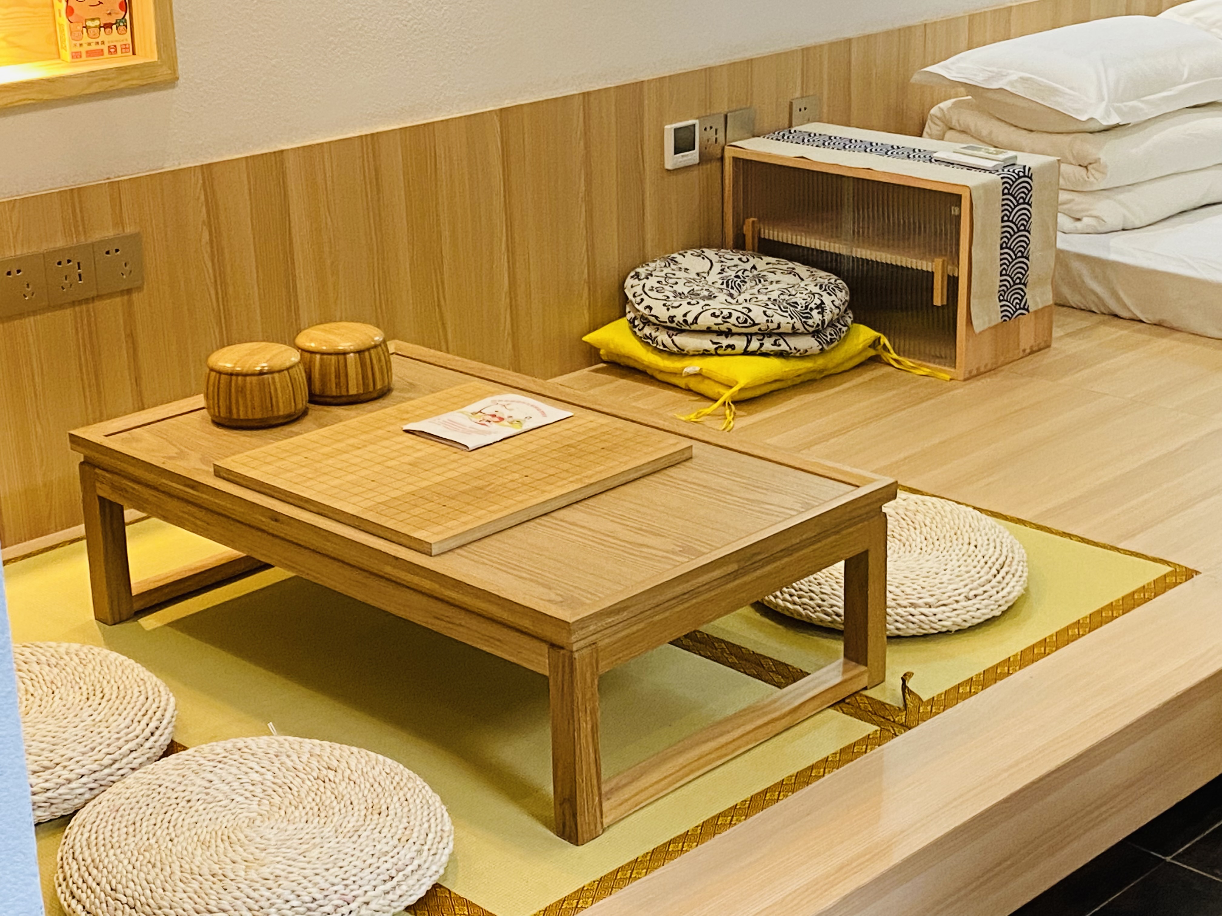 🔹 他们家最有特点的还是房间的内部陈设🖼️🔹 我最最喜欢的就是一进院子左手边那间✨,感觉延续了会客厅的日式风,结合了西北风格,门帘是山西农村常见的大红花布,进去之后是榻榻米类型的,里面几乎是全木制的,有放着棋盘⚪⚫,闲暇时刻可以下会儿棋。 睡的地方放了一个大的懒人沙发那样的东西,对面是悬挂电视📺,在外头逛累了可以把这边当成一个小的家庭影院来看。 卫生间的洗脸盆也是那种编制的,水龙头虽然是铁质的,但做的就像竹子的样式,两者结合起来真的很高级💫 💡整个房间的灯源是暖黄色的,开灯之后整个房间就显得很温馨,我能在里面呆上一天
