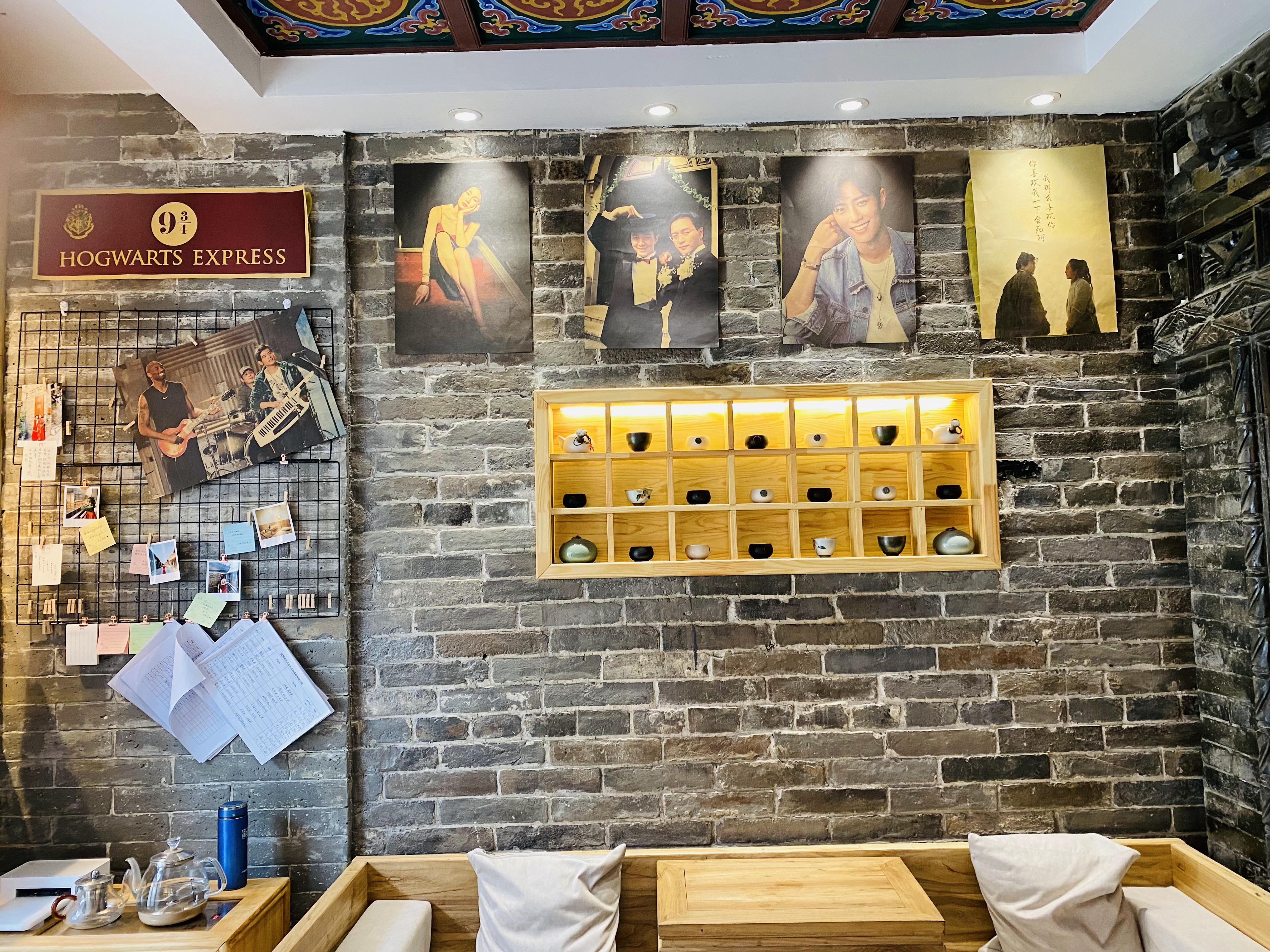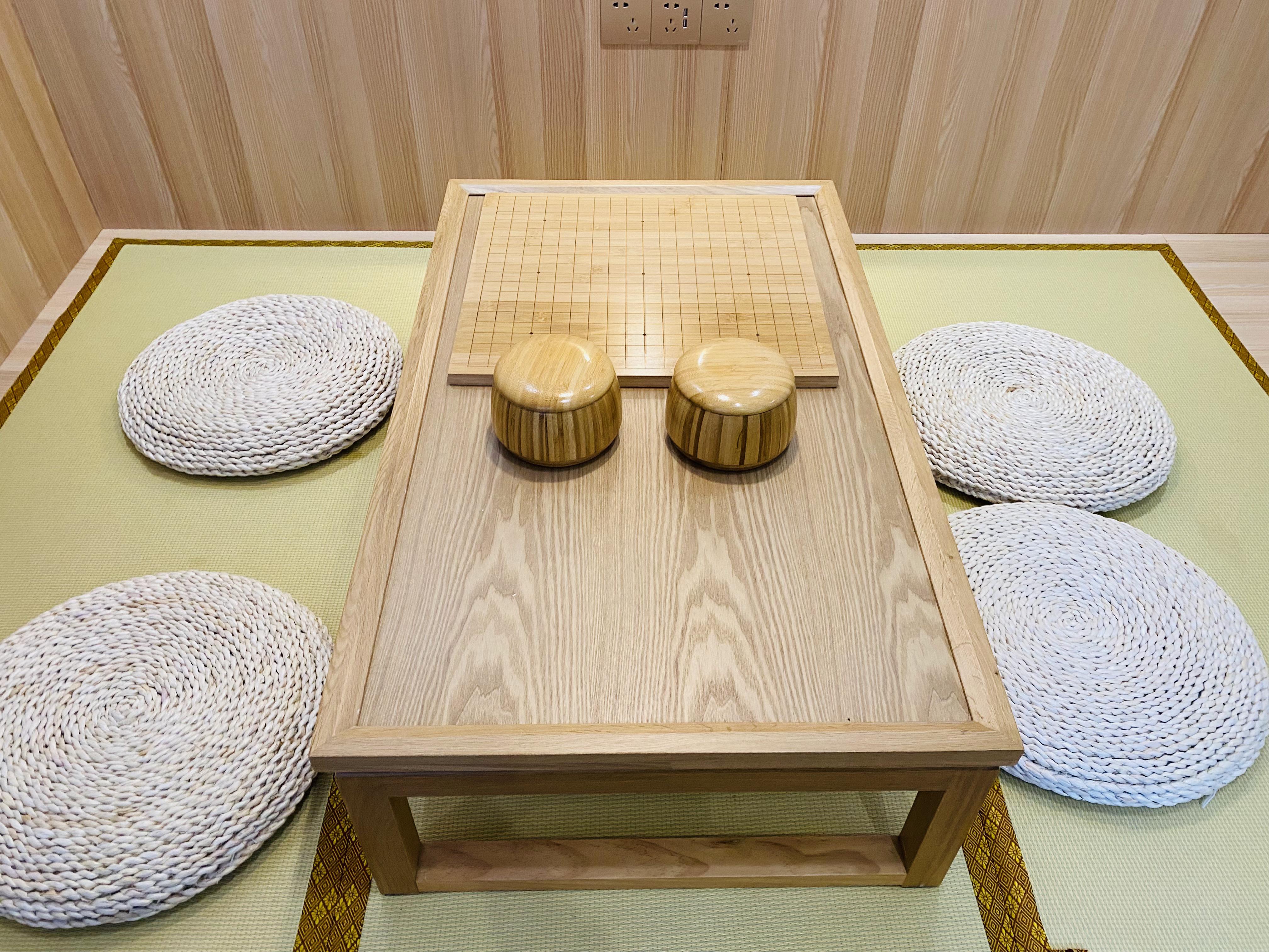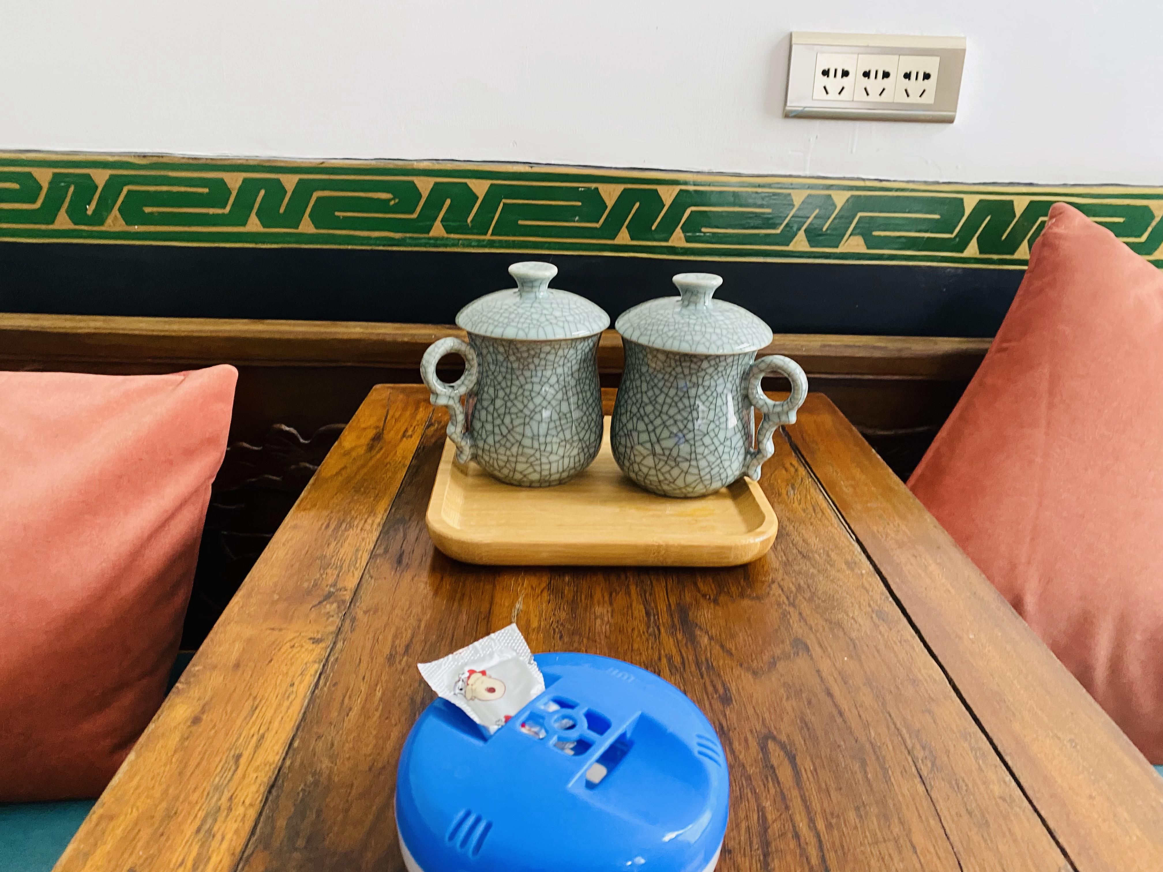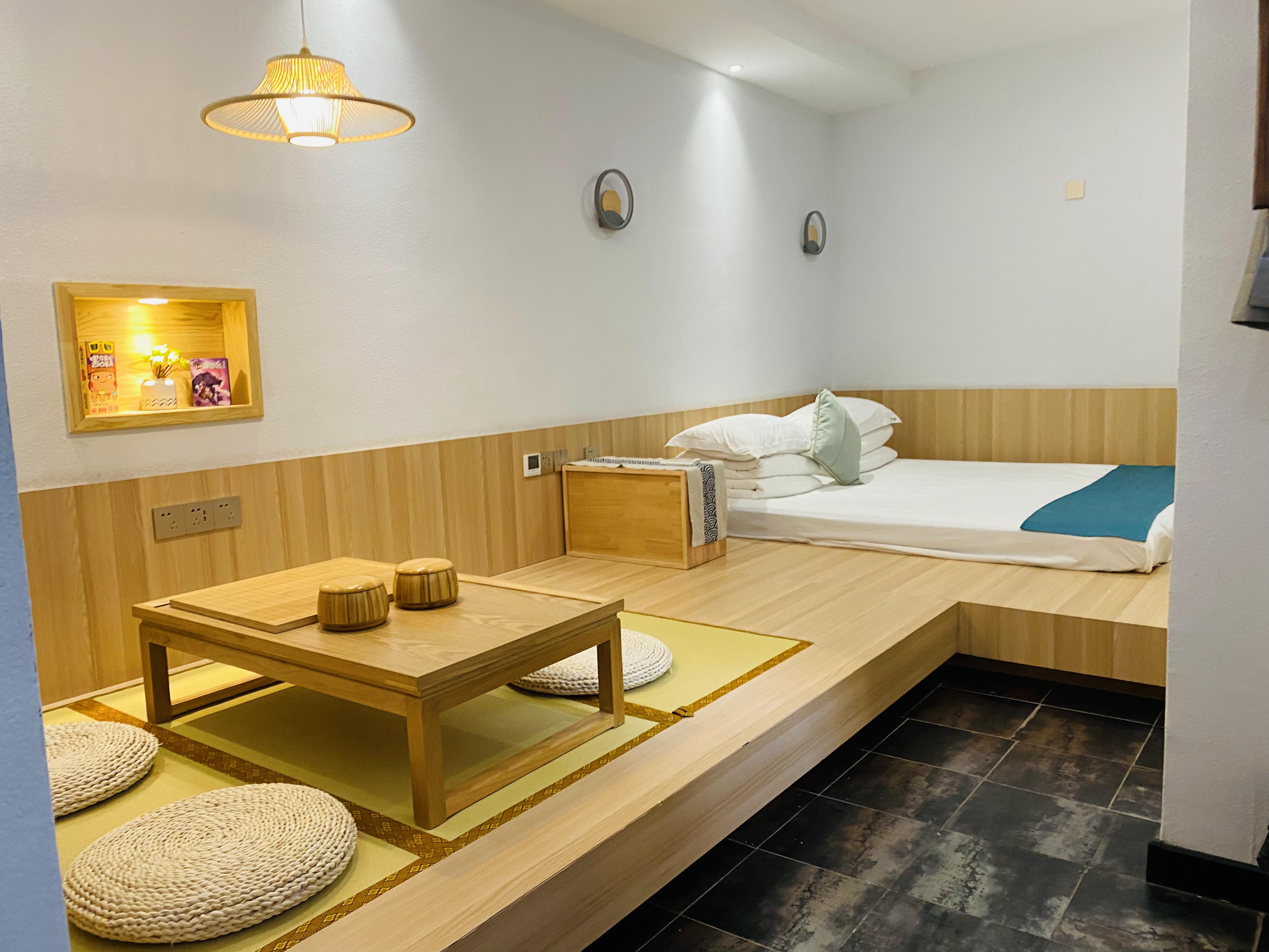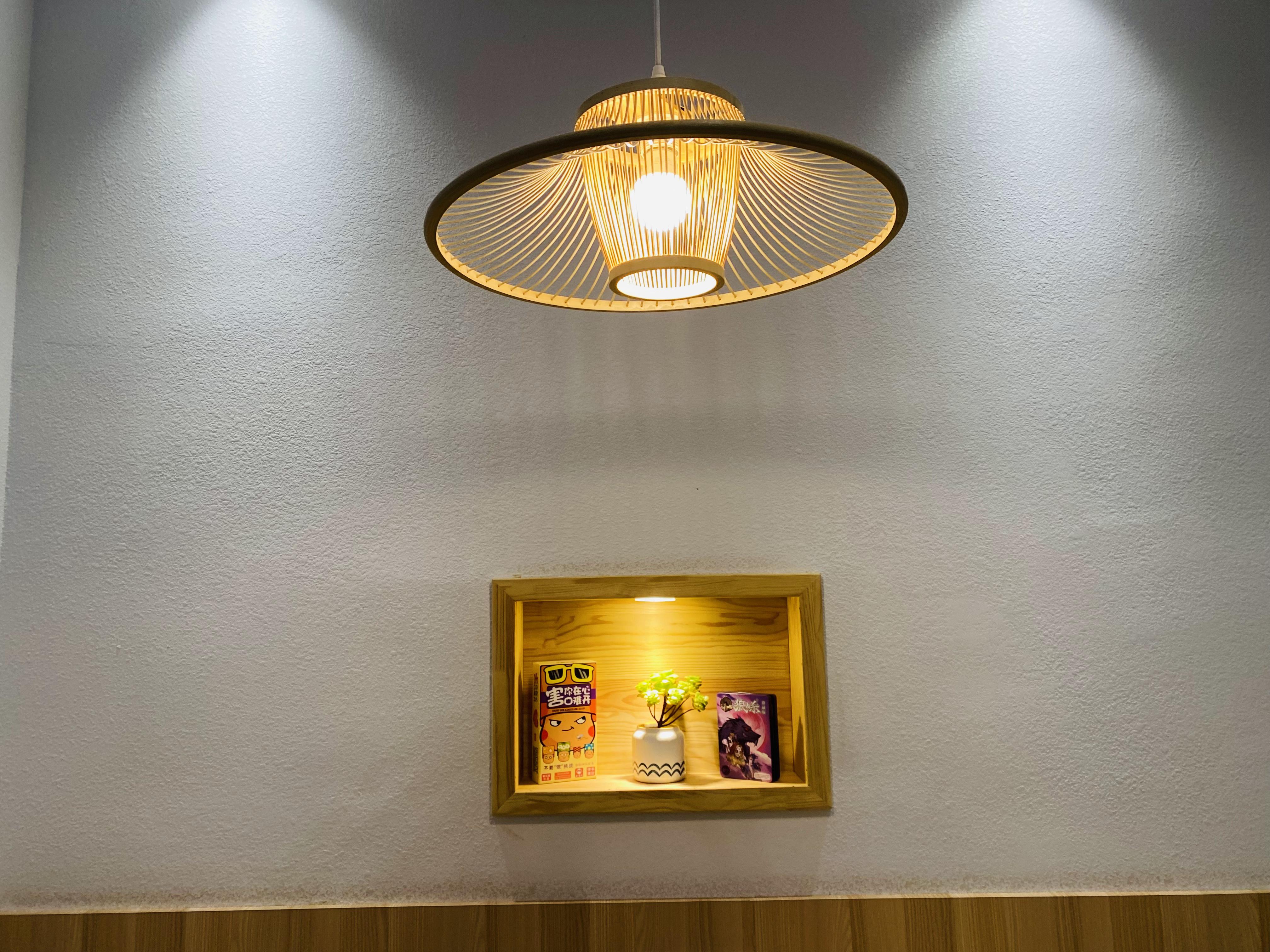 🔹 他们家最有特点的还是房间的内部陈设🖼️🔹 我最最喜欢的就是一进院子左手边那间✨,感觉延续了会客厅的日式风,结合了西北风格,门帘是山西农村常见的大红花布,进去之后是榻榻米类型的,里面几乎是全木制的,有放着棋盘⚪⚫,闲暇时刻可以下会儿棋。 睡的地方放了一个大的懒人沙发那样的东西,对面是悬挂电视📺,在外头逛累了可以把这边当成一个小的家庭影院来看。 卫生间的洗脸盆也是那种编制的,水龙头虽然是铁质的,但做的就像竹子的样式,两者结合起来真的很高级💫 💡整个房间的灯源是暖黄色的,开灯之后整个房间就显得很温馨,我能在里面呆上一天