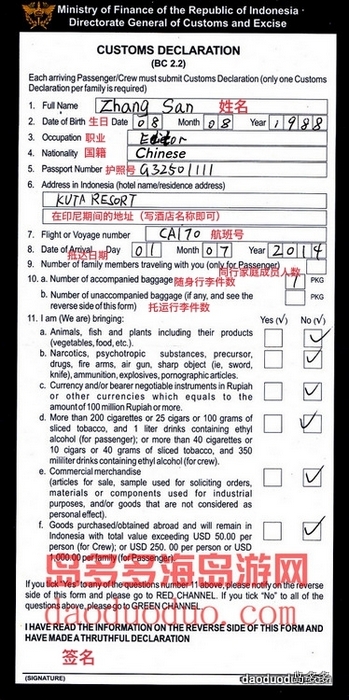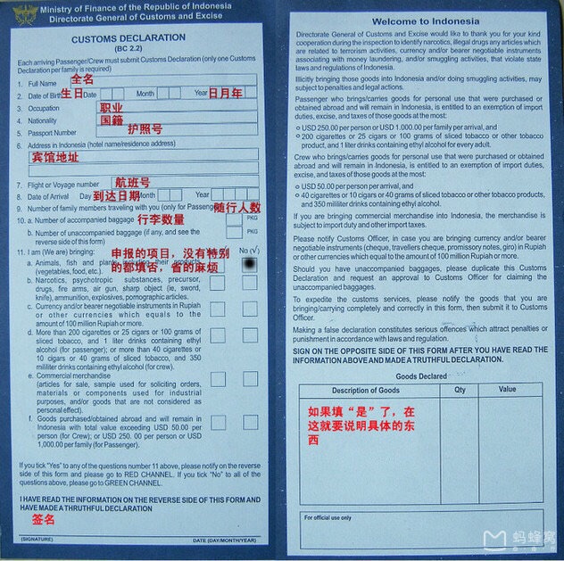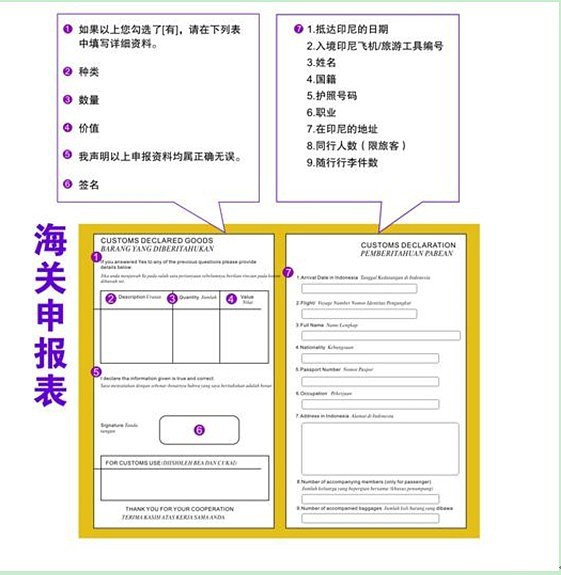 途中拿到印尼出入境卡并填妥相关信息。办理落地签流程:下飞机按机场内标志提示走就可以看到VISA ON ARRIVAL字样柜台,在任意窗口递交护照、填写完毕的出入境卡和落地签证费(USD25/人),窗口工作人员会发给客人一张收据,办理好落地签,同时保管好出境卡。