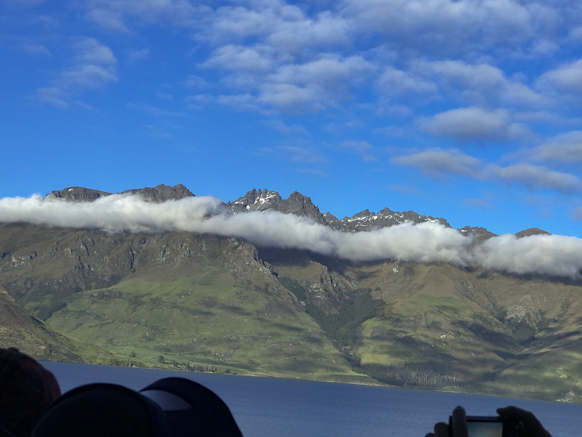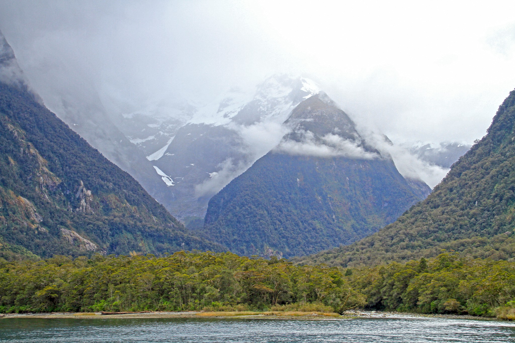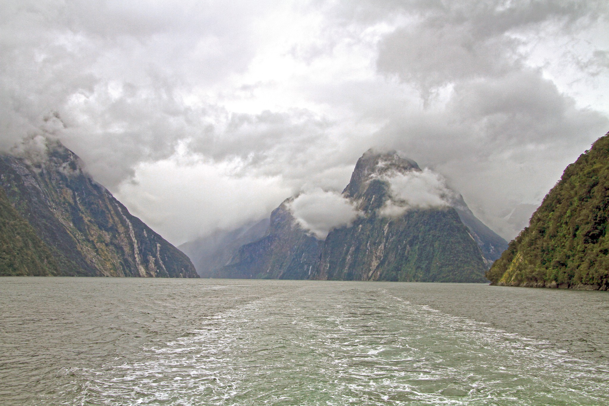 游船在峡湾中穿行,云雾遮掩了峡湾中的一部分美景,但是由于云雾的作用,也产生一种奇幻的感觉。