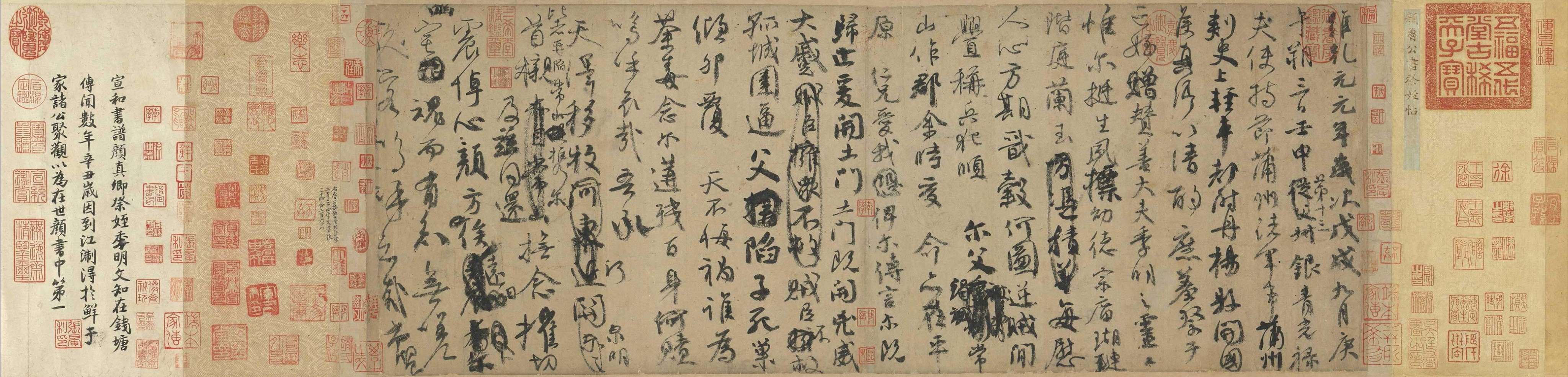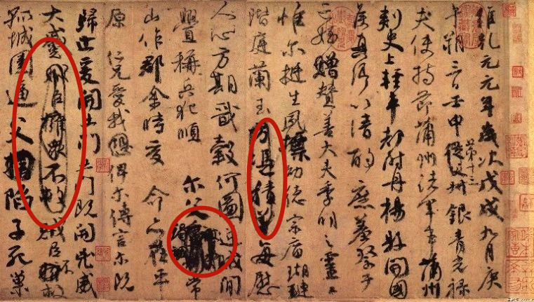 期间用笔之间情如潮涌,不计工拙, 涂改、勾画,多数笔触写至枯槁,苍劲有力。无不透露出他当时的心情,“父陷子死,巢倾卵覆”、取义成仁之事,让颜真卿悲愤异常。
