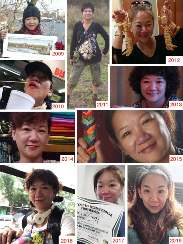 (1),十年来我的身高三围体重都没变,脸上皱纹很给力没长太多!就是下眼袋掉下来一些,因为爱笑所以八字紋也深了些,外型上最大的不同就是白发....2015年白发便无法无天的一直变多,多到我只要两个月没染发就白发苍苍看起来像是力尽沧伤的女人实在有损我江湖小侠~三岁的名号!所以在装扮上只好戴发带或帽子来遮住头顶上的白发!