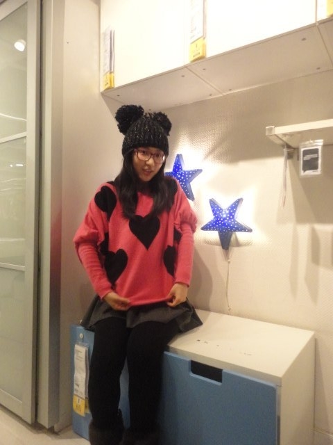 大大的蝙蝠袖,双毛线球帽子,大框眼镜,还有衬得小腿像短萝卜一样的粉色短靴和毛毛靴套
