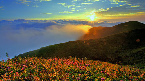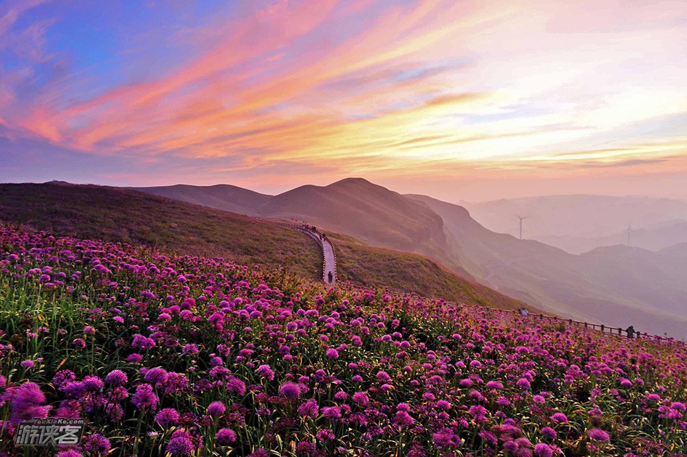 登上小韭菜坪最高峰,可以把三县一区尽收眼底。而且喀斯特地貌丰富,石林造型各异,喀斯特大密宫 “盆景石林”、“迷宫石林”、“水冲石林”、“象形石林”都能一次体验。虽然贵州地处高原,但是因为纬度原因,这里常年温暖,尤其是毕节地区冬无严寒、夏无酷暑。最为炎热的盛夏,毕节的平均气温也仅为22℃,是贵州境内最凉爽的地方。而当大部分地区进入冬季的时候,这里仍然温暖和煦。所以当8-9月份来韭菜坪旅游,绝对能够一饱眼福。除了韭菜花,小杜鹃及日出、云海、怪石等众多景点十分迷人。韭菜坪的山脚下分布着零零星星的彝族村寨,彝家人热情好客,民族风情浓郁,遇到节日,彝族人的美妙铃铛舞更让人觉得留恋。