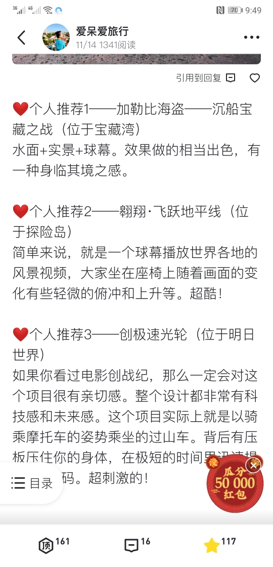 推荐以下必玩项目:创世纪急速光轮(超刺激的过山车)、加勒比海盗沉船宝藏(震撼的视觉体验)、雷鸣山漂流(坐的漂流船会360度随泼旋转)、翱翔飞跃地平线(视觉享受)、晚上的焰火表演。========== 如果你觉得TA的回答不错,快来给TA点个赞吧! 你的支持是对作者莫大的鼓励~显示全部