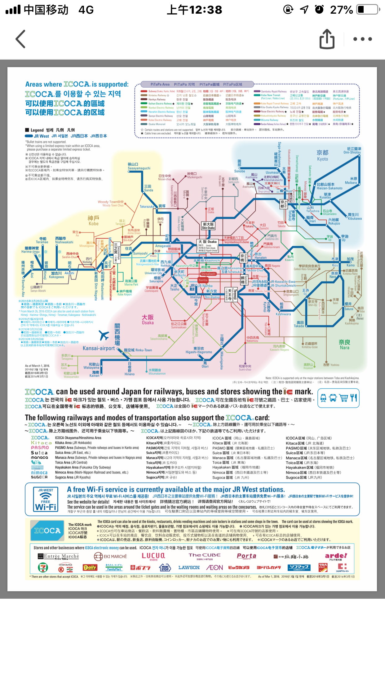 如下照片是ICOCA使用范围。我是在西日本JR官网截屏的,如果看不清可以去官网下载。
