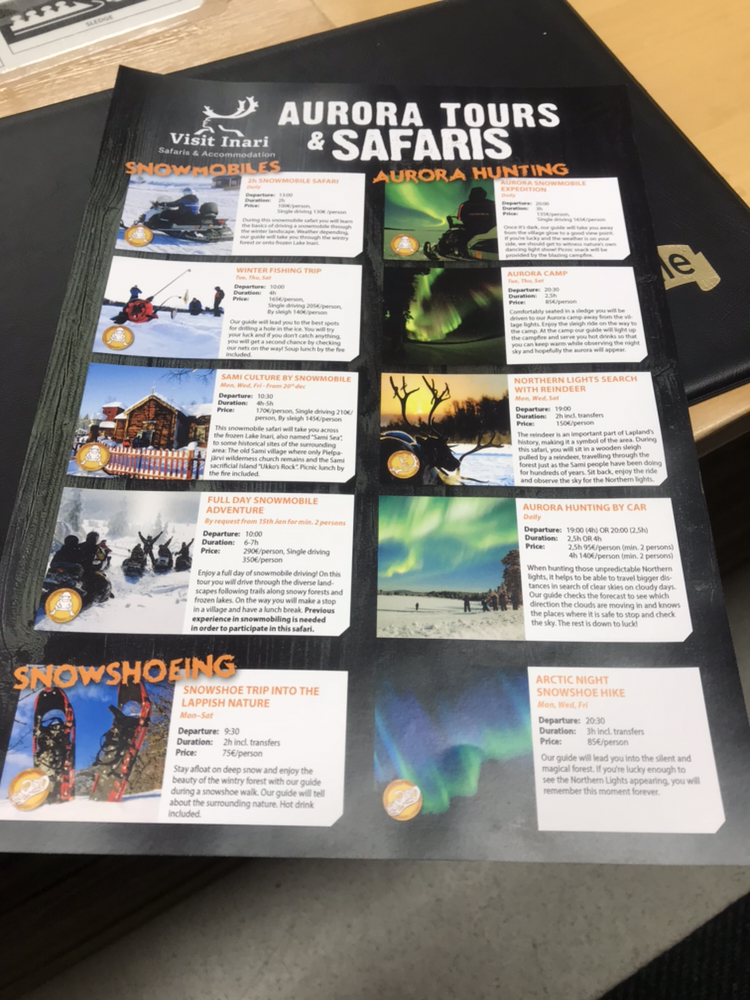 我是住在旷野冰屋酒店,就在伊纳里湖边,视野开阔,适合拍照,也是在那里拍到了极光。伊纳里镇子最有名的应该是***这家公司了,他们有自己的酒店,酒店旁边就是游客中心,我在那里报的雪地摩托+冰钓和哈士奇雪橇大冒险。他们也有追极光的团,也有配合的,比如晚上雪地摩托+极光或者徒步或者滑雪+极光团,不过一... 显示全部