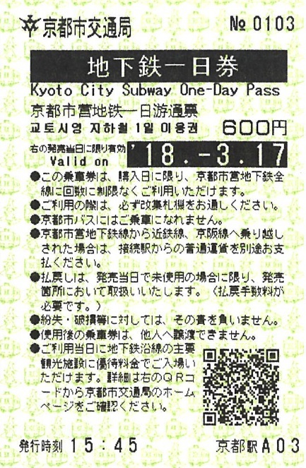 京都地铁一日券在以下地方有售:地铁各站窗口地铁各站自动售票机市营公共汽车·地铁问讯处,定期车票销售所有效期:一天(当天)自动售票机卖出的票:大人票 ↓小儿票 ↓塞入闸机绿色箭头处,然后前方再取票========== 如果你觉得TA的回答不错,快来给TA点个赞吧! 你的支持是对作者...显示全部