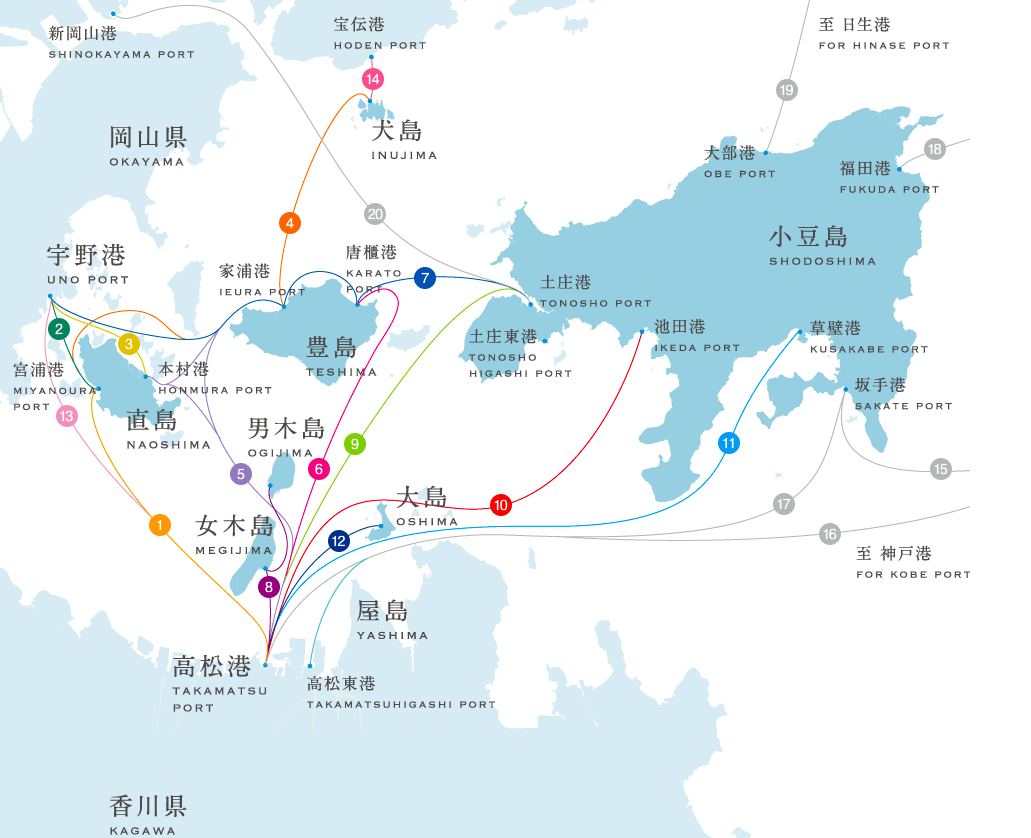 下图给你答案,彩色的标示有数字的线,就是船的航线。大家可以发现,大部分的航线都是从高松港出发的。
