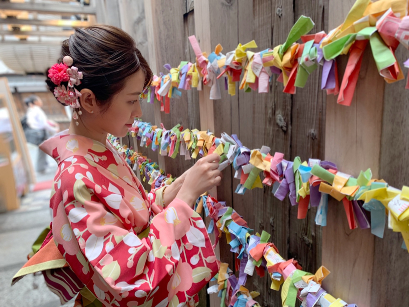 这时我们除了拍摄全身照,还可以选择半身照拍摄,选择在建筑门前拍摄半身照,可以着重突出和服的妆发(和服店是有提供妆发服务的)。