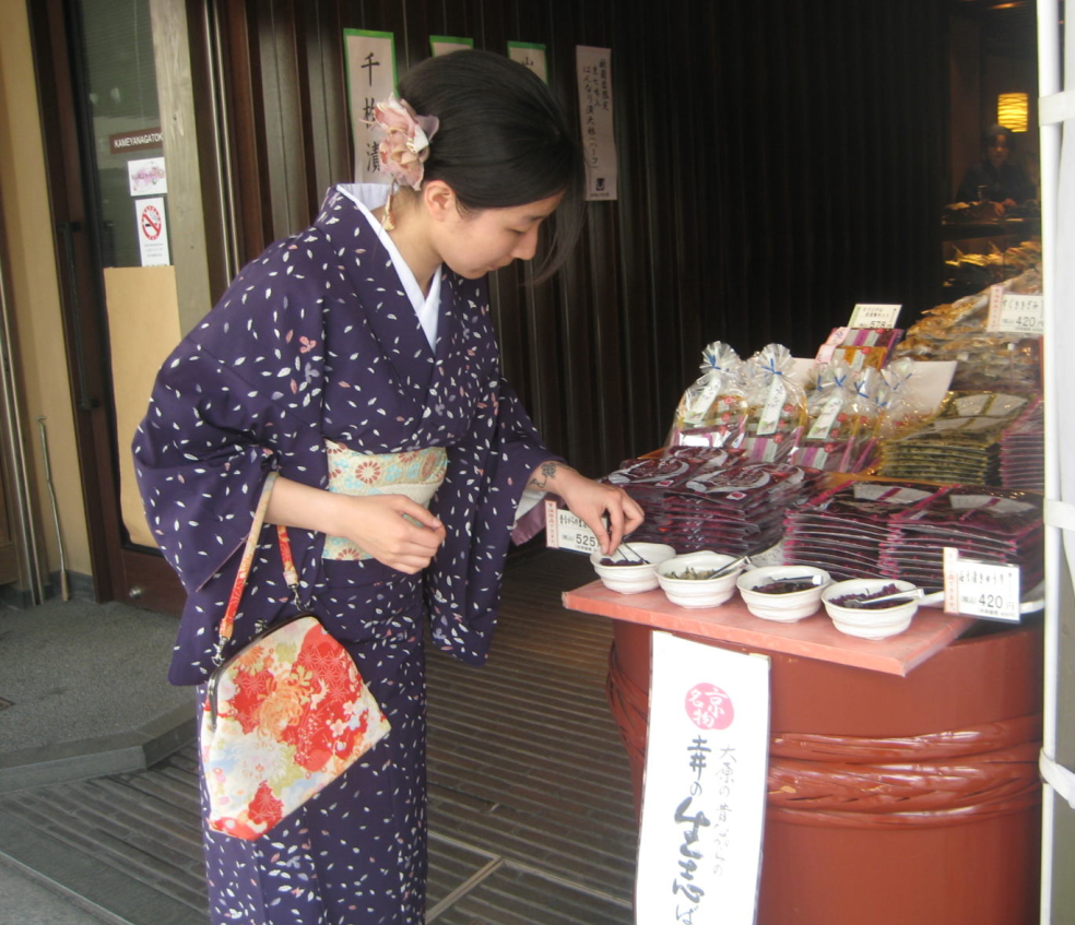 然后我们可以抓拍一些动态状态下的照片,比如在神社祈福的侧面照,这种情况可以把人物和景融合在一起拍摄,还可以在一些小店吃些日本特色小吃,这种情况下不管是坐姿还是站姿都可以进行一些动态的抓拍。
