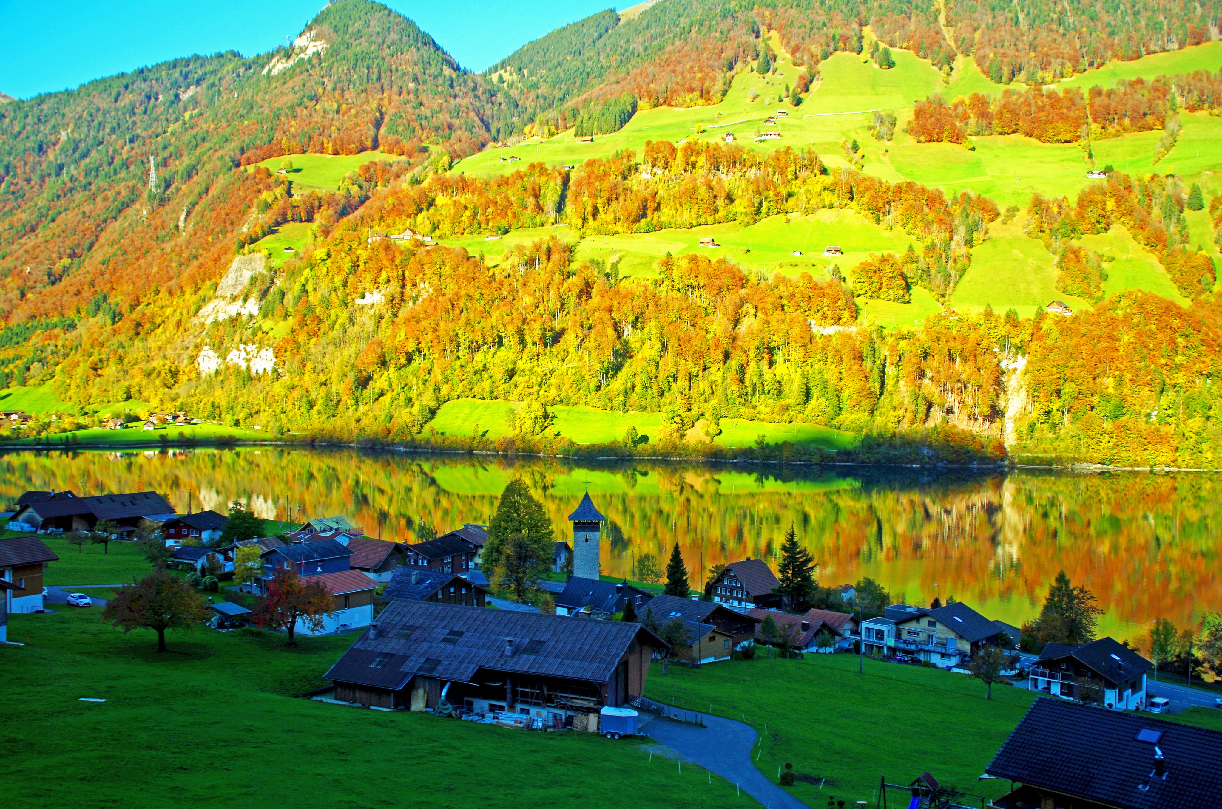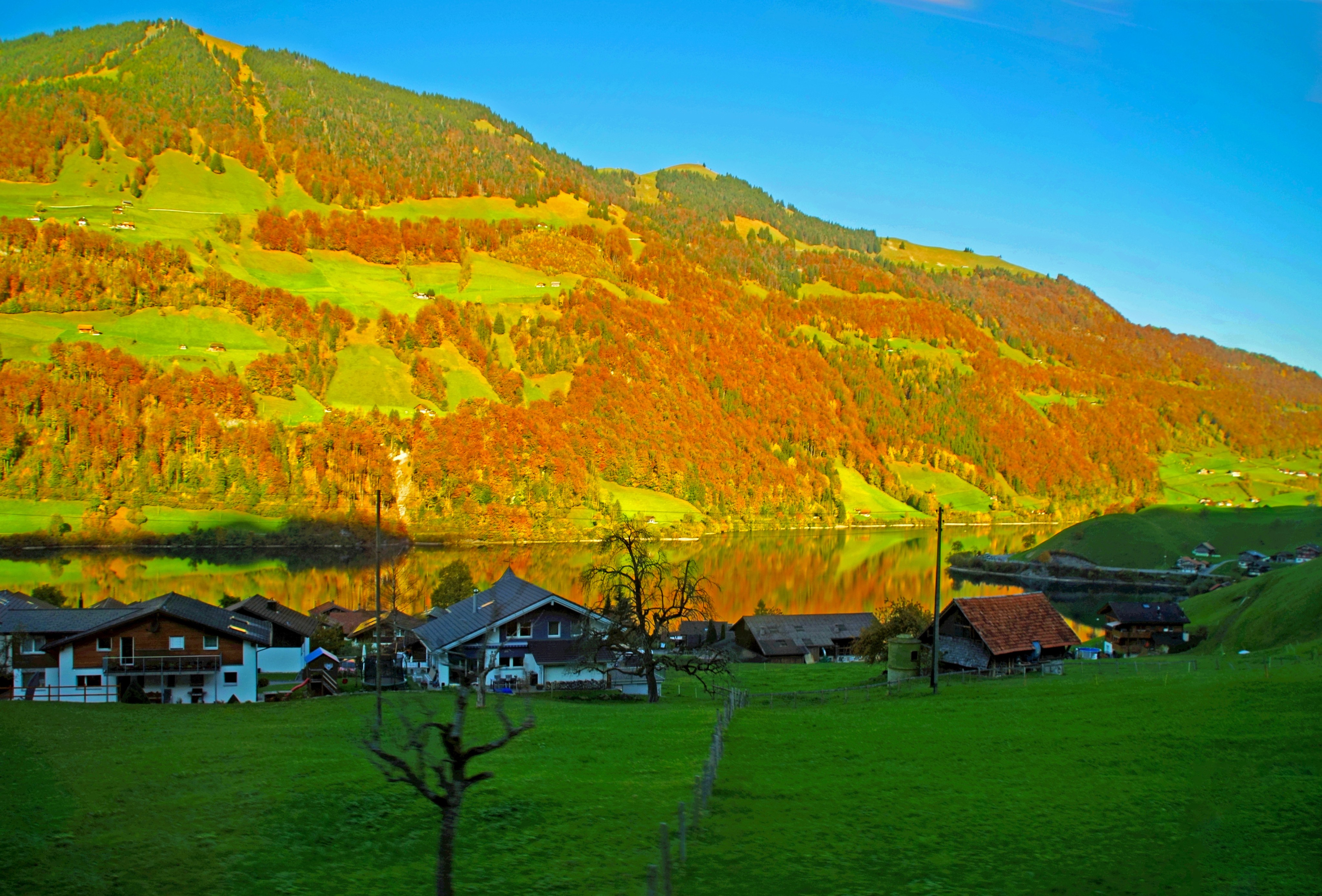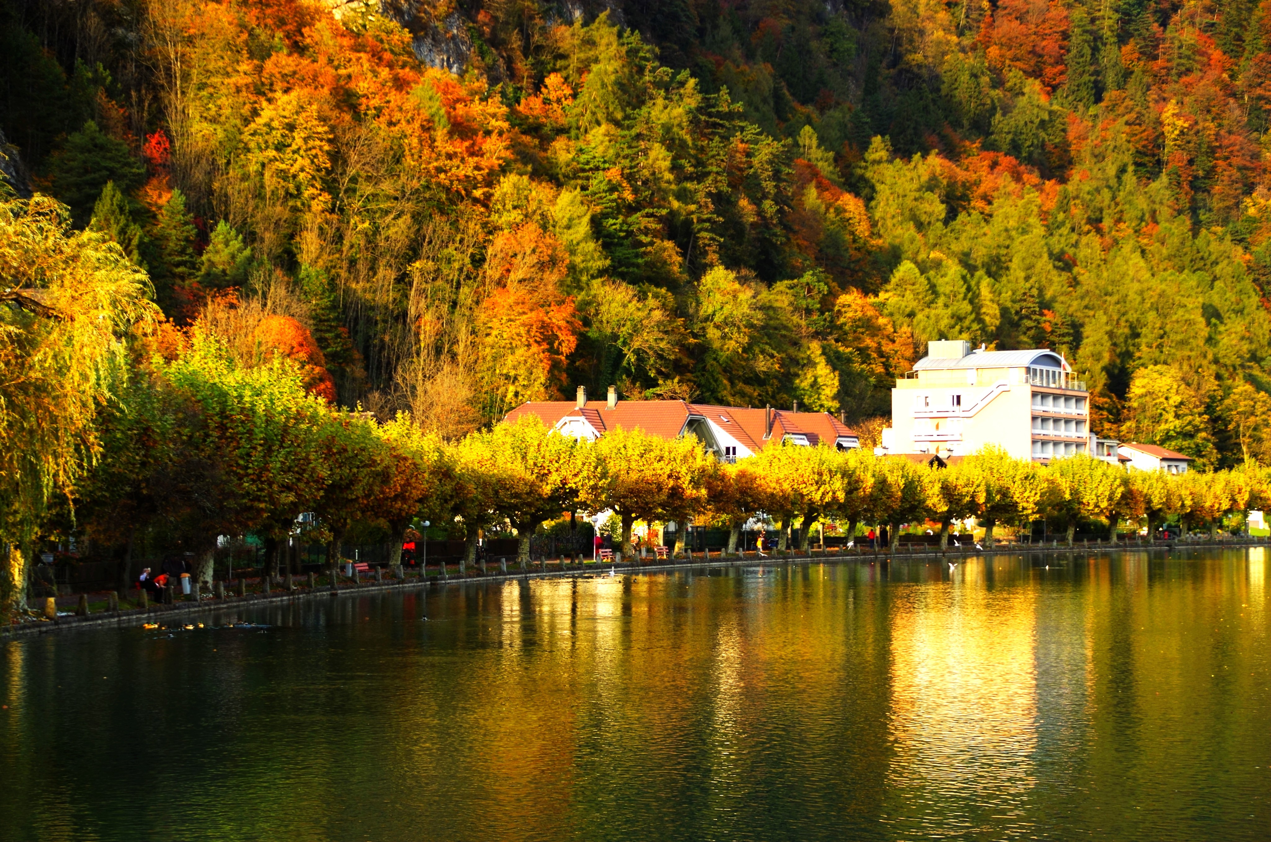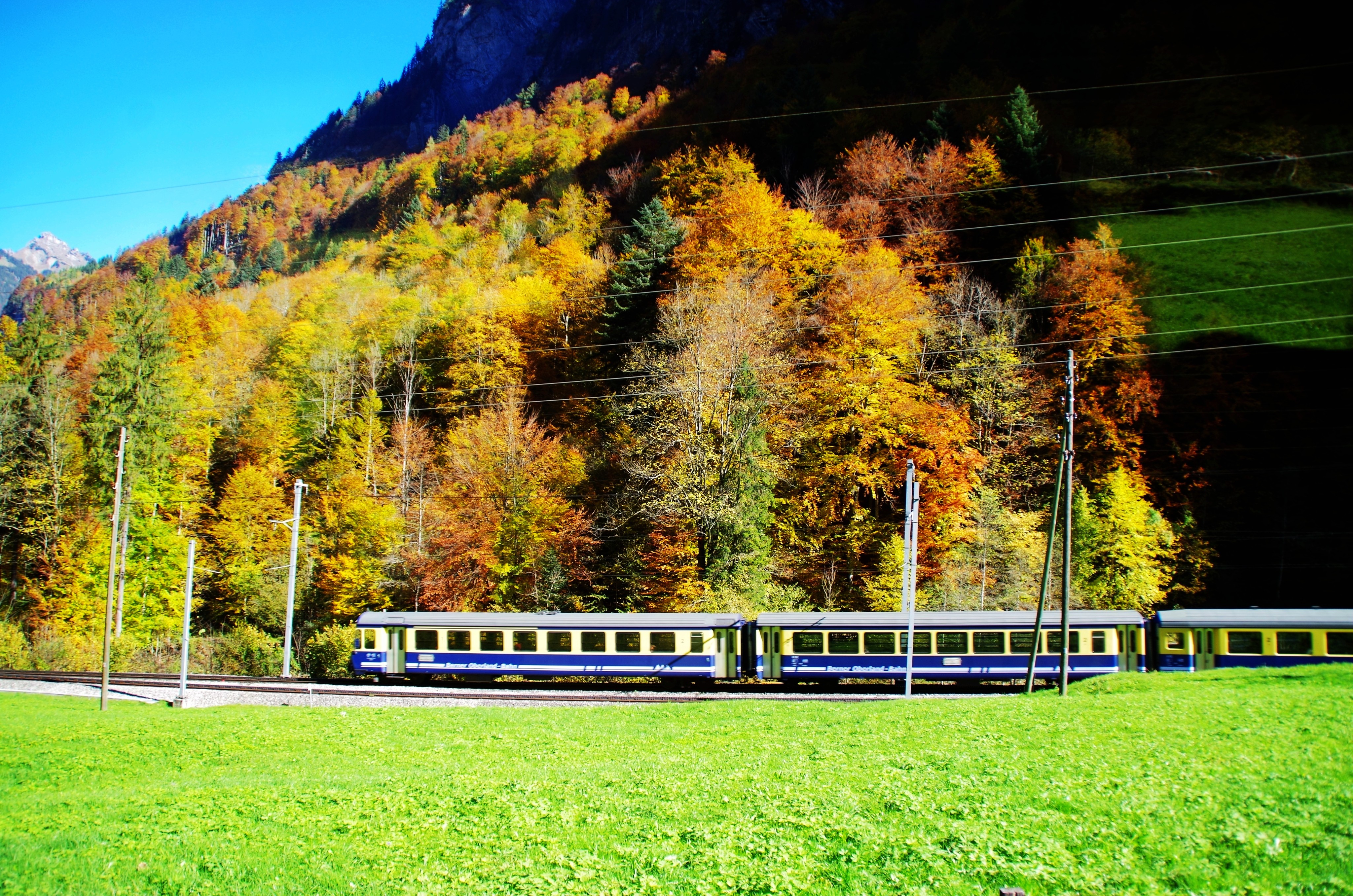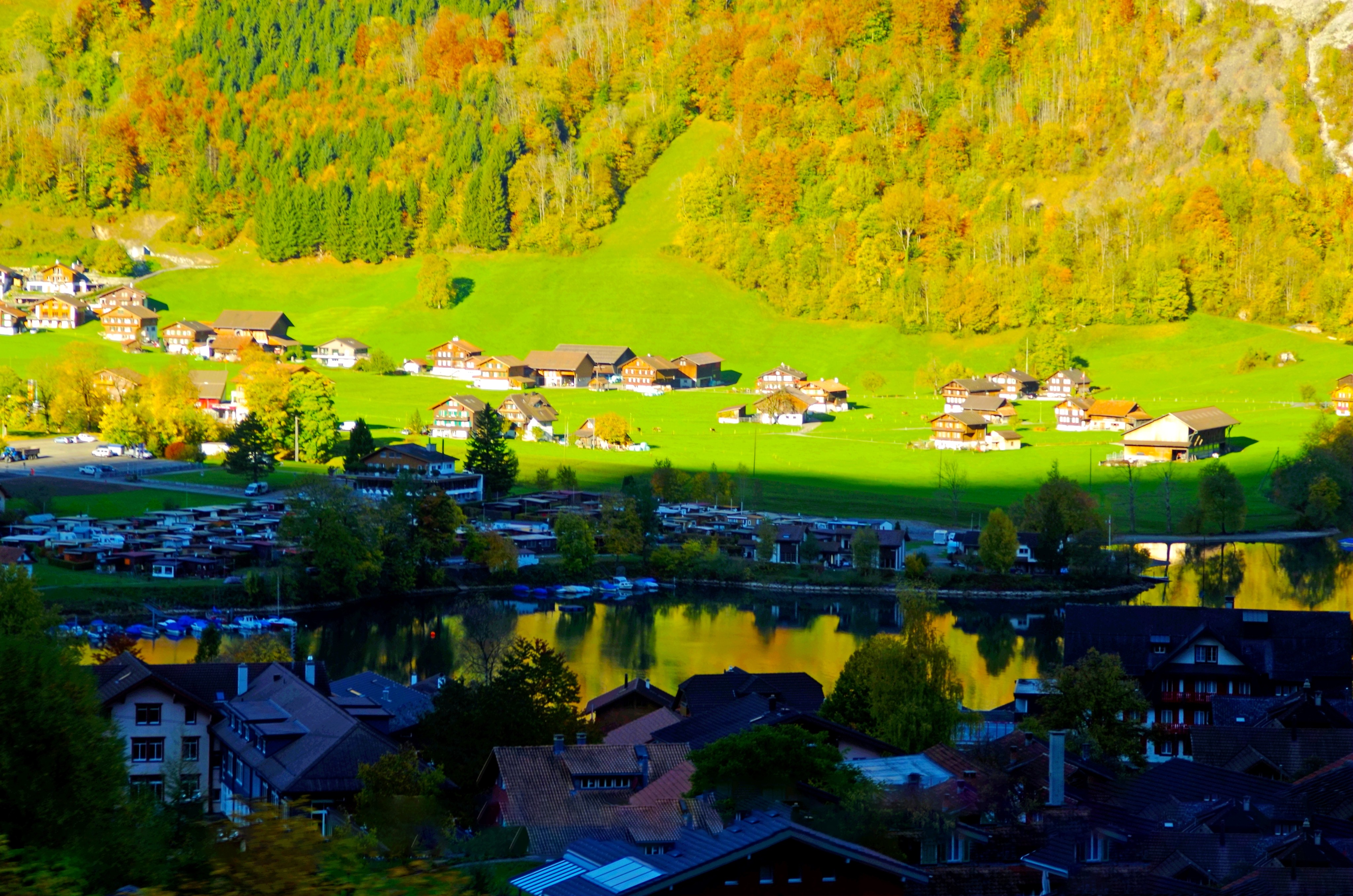 Interlaken ,也被称为金色山口线, 这段路75公里,特别开设了金色山口快车(Luzren-Interlaken Express),共2小时车程。乘坐金色山口列车浏览绝美湖光山色,一幅雪山、湖泊、森林和平原的长长画卷在眼前缓缓展开。雪山下优美宁静的小镇,微风拂过湖面悠然荡起涟漪,一副岁月静好的模样。