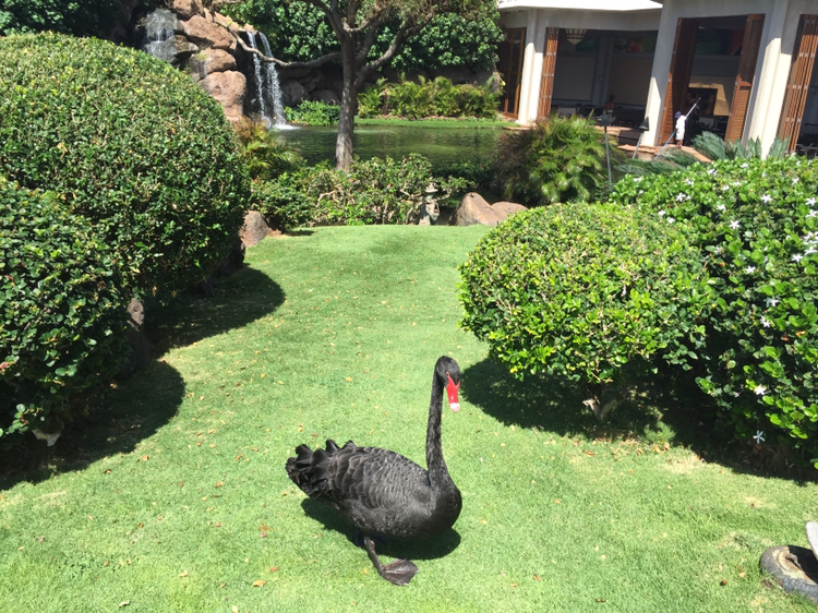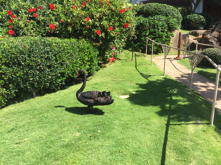 酒店内,偶遇一只悠闲踱步黑天鹅,憨态可掬。