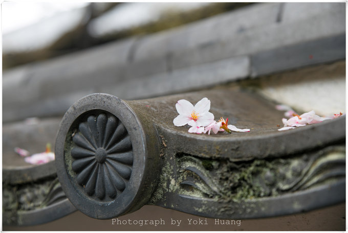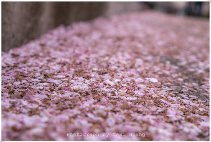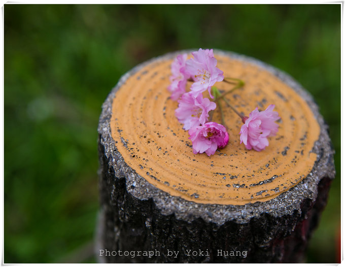 这张照片是我把掉落在地上的樱花收集,放在了木桩上,拍了一个小品。
