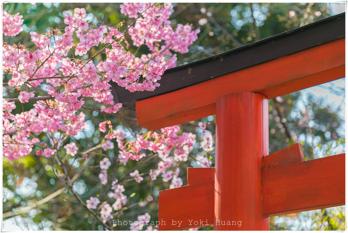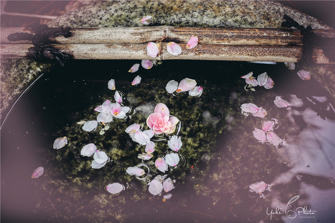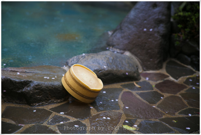 我在春日泡温泉前拍摄过池塘傍的花瓣,主体是用了温泉小桶。