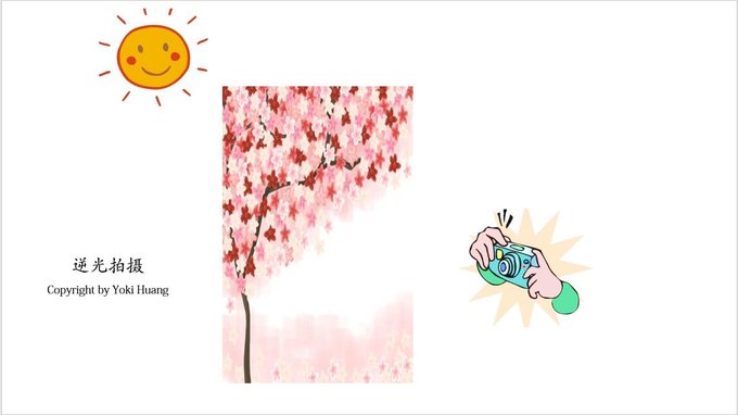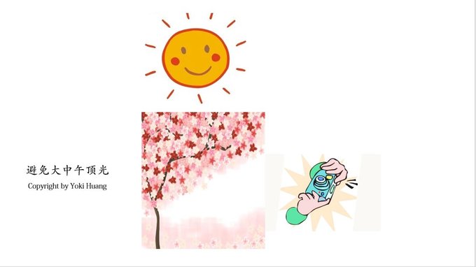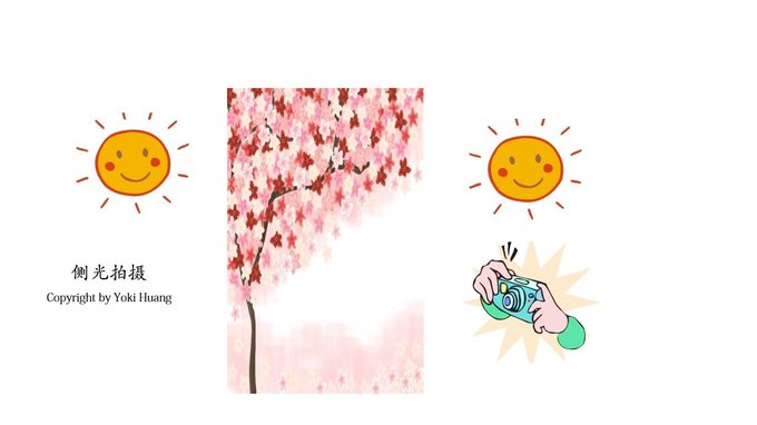顺光拍摄:是拍摄最多的一种用光方式,太阳照射的方向和你相机的方向是一致的,就叫做顺光。从上图可以看到,相机对着花树在拍摄,而太阳在后方,这样的光线运用就是顺光。