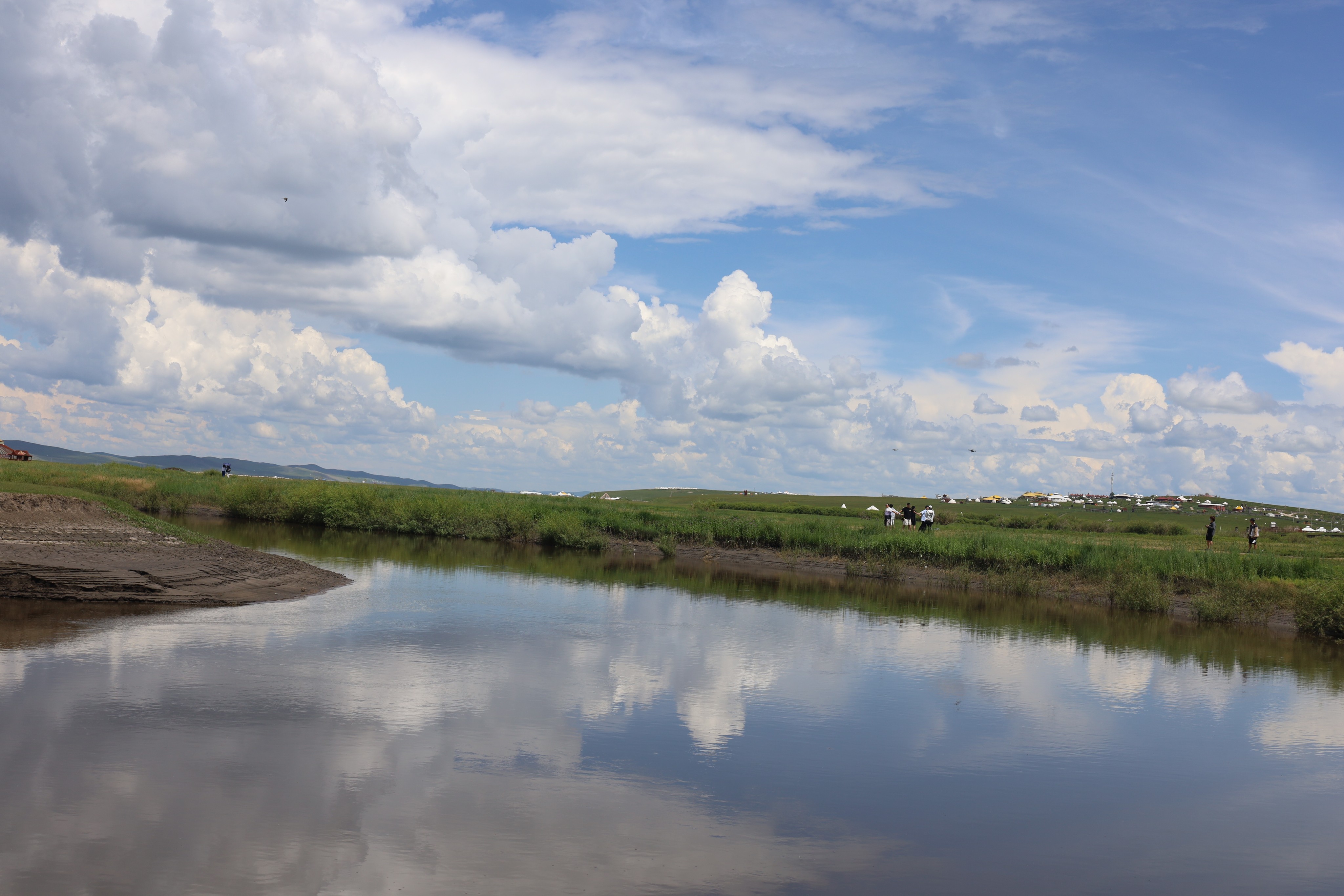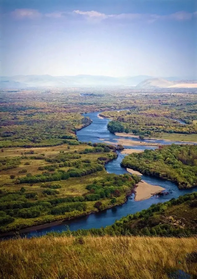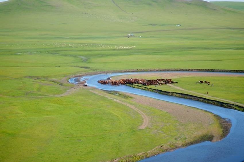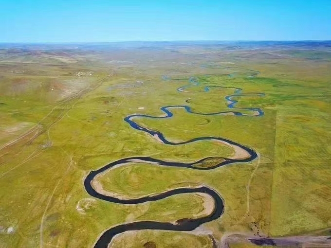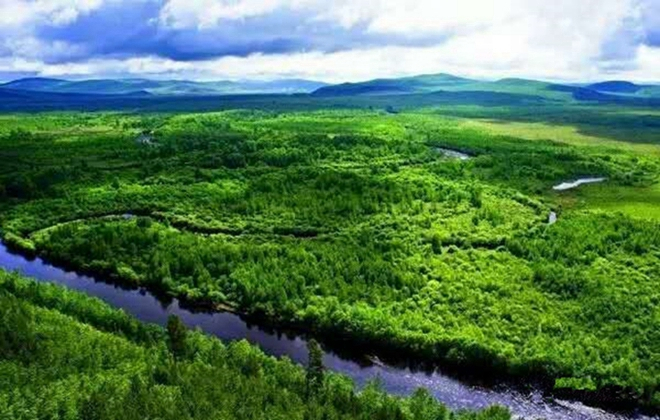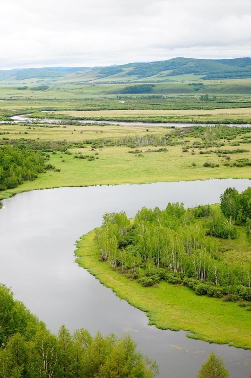 3、莫日格勒河:境内有一条世界闻名遐迩的'天下第一曲水"------莫日格勒河,她发源于大兴安岭西麓,由东北向西南,流经著名的大草原,注入呼和诺尔湖后流出,汇入河,全长290多公里,属中俄界河河水系。莫日格勒河是一条河道十分狭窄,但却极度弯曲的河流.从空中俯瞰,蜿蜿蜒蜒的河水,就象是一条被劲风舞动着的蔚蓝色绸带,悠然飘落在碧绿如玉平坦无垠的大草原上,一会儿东行,一会儿西走,一会儿南奔,一会儿北进,其弯曲程度,用九曲十八弯来形容是远远不够的;它顺流逆流,对流倒流,往往返返,迂回曲折,顾盼留连,忘情的抚弄着草原的肌肤,全部流程几乎都是在弯曲的流动中完成的,如诗的婉约韵律,如画的飘逸线条,如歌的跳跃音符,如书法的酣畅墨意。莫日格勒河之曲,却纯粹是大自然的天工造化,没有一点儿斧凿之处,是真正的原生态景观。