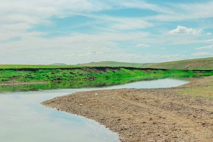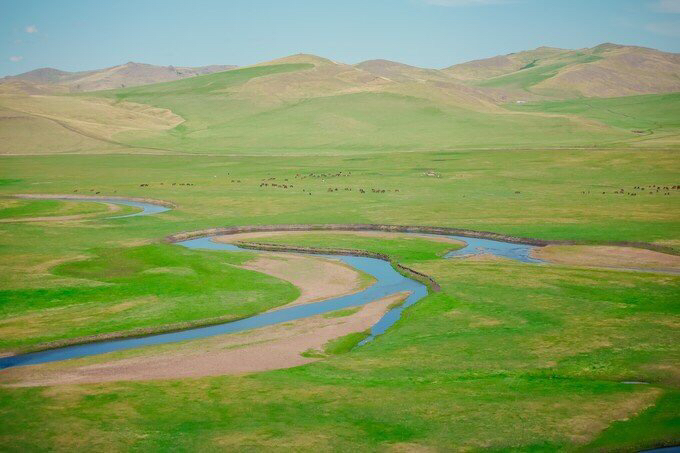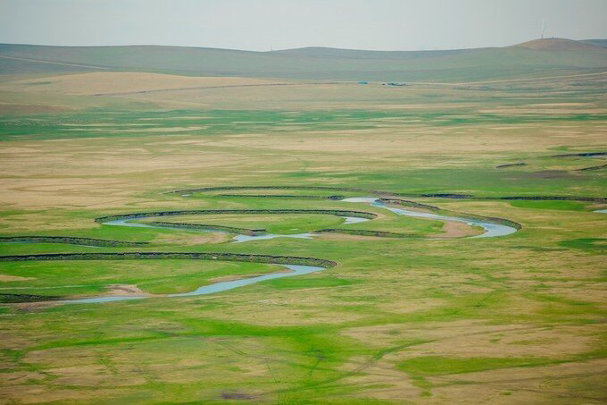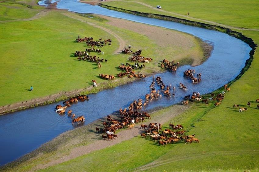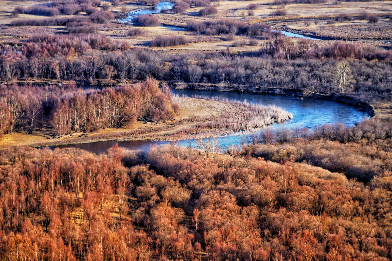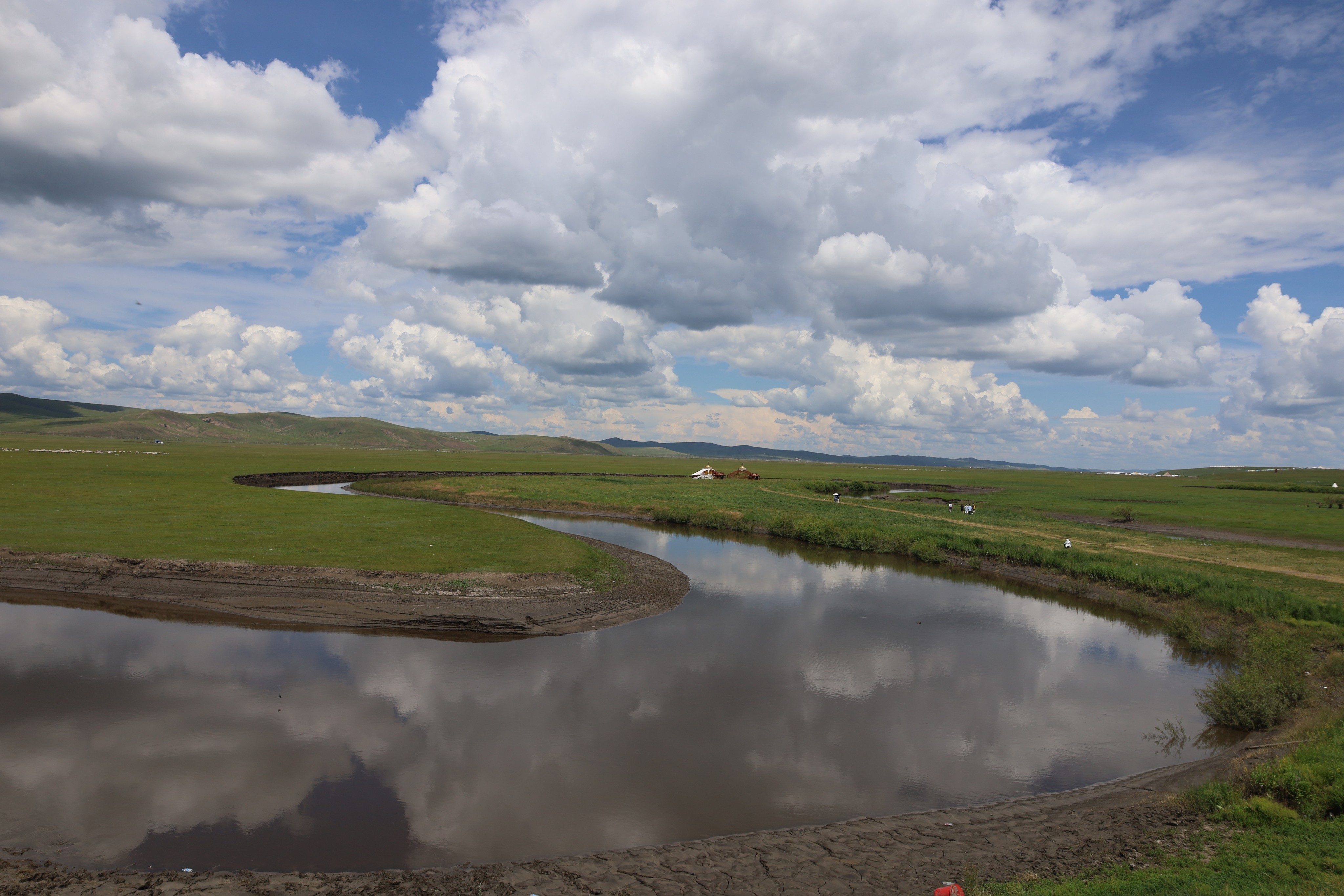 3、莫日格勒河:境内有一条世界闻名遐迩的'天下第一曲水"------莫日格勒河,她发源于大兴安岭西麓,由东北向西南,流经著名的大草原,注入呼和诺尔湖后流出,汇入河,全长290多公里,属中俄界河河水系。莫日格勒河是一条河道十分狭窄,但却极度弯曲的河流.从空中俯瞰,蜿蜿蜒蜒的河水,就象是一条被劲风舞动着的蔚蓝色绸带,悠然飘落在碧绿如玉平坦无垠的大草原上,一会儿东行,一会儿西走,一会儿南奔,一会儿北进,其弯曲程度,用九曲十八弯来形容是远远不够的;它顺流逆流,对流倒流,往往返返,迂回曲折,顾盼留连,忘情的抚弄着草原的肌肤,全部流程几乎都是在弯曲的流动中完成的,如诗的婉约韵律,如画的飘逸线条,如歌的跳跃音符,如书法的酣畅墨意。莫日格勒河之曲,却纯粹是大自然的天工造化,没有一点儿斧凿之处,是真正的原生态景观。