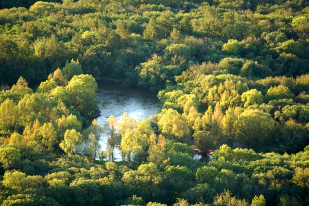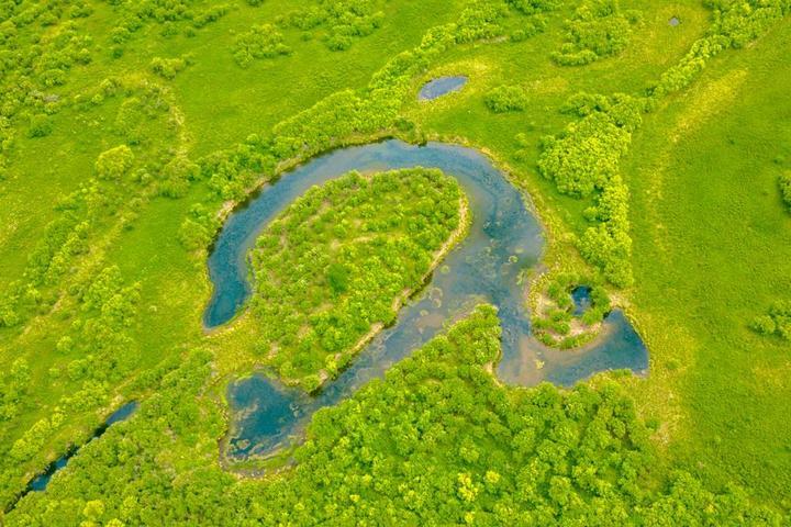 白鹿岛,有两个修长小岛相偎而卧,河水呈“ Ω ”形回环于两个小岛之间,岛上野花丛生、红豆遍地,松黛桦橙,山光水色,美不胜收。