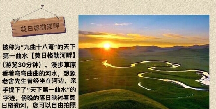 部分景点简介(一)金帐汗:金帐汗蒙古部落,位于草原"中国第一曲水"的莫尔格勒河畔,距离市区约40公里。这里是"天苍苍,野茫茫,风吹草地见牛羊"的草原腹地,历史上很多游牧民族都在这里成长和壮大。在金帐汗蒙古部落内,游客能够欣赏到精彩的套马、驯马表演,蒙古式克、角力擂台赛、祭敖包、萨满宗教文化表演,还能参加热闹的篝火晚会,你可以品尝到地道的蒙古盛宴,烤全羊、马奶酒等蒙古族的民族食品,在这里都能一饱口福。景区内的日常表演也会让游客目不暇接,大型实景演出《苍狼大地》、狩猎文化实景演出《成人礼》等等,还有蒙古长调、马头琴、呼麦等蒙古族表演艺术,都是视觉听觉上的一道大餐。莫日格勒河:草原上有一条被称为天下第一曲水的河流叫做莫日格勒河,莫日格勒河在境内。莫日格勒河号称天下第一曲河,它发源于大兴安岭西麓,由东北向西南,流经著名的大草原。注入呼和诺尔湖后流出,汇入河,全长290多公里,属中俄界河河水系。莫日格勒河是一条河道十分狭窄,但却极度弯曲的河流。如果从空中俯瞰,蜿蜿蜒蜒的河水,就象是一条被劲风舞动着的蔚蓝色绸带,悠然飘落在碧绿如玉平坦无垠的大草原上。一会儿东行,一会儿西走,一会儿南奔,一会儿北进,其弯曲程度,用九曲十八弯来形容是远远不够的。湿地:原名湿地,2009年之后更名为地。湿地位于市郊,是中国目前保持原状态最完好、面积最大的湿地,被誉为"亚洲第一湿地"。这里地形平缓开阔,河的支流从这里蜿蜒流过,形成了壮观秀丽的河流湿地景观。景区里有开阔的灌丛草甸,一望无际。依赖湿地生存繁衍的野生动植物也极为丰富,每年在这里迁徙停留、繁殖栖息的鸟类达到2000万只。这里是世界上最重要的丹顶鹤繁殖地之一,也是世界濒危物种鸿雁的重要栖息地之一。景区内游玩,需要登顶海拔720米的主峰,远眺湿地全景。体力较弱者可乘电瓶车,时间充裕的话建议步行登山。从游客中心的木栈道走下去,再上坡就是最高的瞭望处,可以从不同角度观赏山崖下的湿地。其中,最具代表性的景观就是形如一片叶子的湖心岛。在山顶还能俯瞰蜿蜒流淌的及市貌,蓝色粉色屋顶的房子交错,很是好看。如果待到傍晚,落日下的湿地会给你更多惊喜。源国家湿地公园:源国家湿地公园总面积***公顷,各类湿地面积***公顷,湿地率***%。湿地公园拥有森林、沼泽、河流、湖泊等多种生态系统,森林与湿地交错分布,处于原始或者自然状态,是众多东亚水禽的繁殖地,是目前我国保持原生状态最完好、最典型的寒温带湿地生态系统。公园的主体——,是河最大的支流之一。担负着河水量供给和水生态安全的重任,维系着大草原的生态安全。源国家湿地公园本着保护自然生态、体验自然和谐的原则,努力打造高起点、高品质、高水准的景区。这里是您亲近自然、放松心情的最佳胜地;是您告别喧嚣、回归宁静的"天然氧吧";是您体验野外探险、净化心灵的人间仙境。白桦林景区:距市市区40公里处。传说成吉思汗的千军万马途经此地时,认为这是吉祥的化身,并在这里驻足休憩,安营扎寨;而来这里采伐的俄国人在赞叹她美丽的同时亦放下屠刀,于是,一首优美动人的俄罗斯歌曲《白桦林》应运而生并传唱多年。白桦林景区占地面积近1000公顷,是距市区最近的一片原始森林。被誉为"纯情树"的白桦树婀娜多姿,笔挺的枝干仿佛深入天空。白桦树是的市树,的白桦林与别处不同,洁白的树干仿佛继承下了欧洲的血统,枝干上的稀疏黑色仿佛从天空落下的黑色雨点,风干在枝干上。白桦树的用处十分广泛,桦皮可以做屋顶防雨材料,又可以引火,是制作桦皮画、桦皮饰品上好原料。莫尔道嘎国家森林公园 :莫尔道嘎国家森林公园位于中部,"南有西双版纳,北有莫尔道嘎",莫尔道嘎是中国最北部的针叶原始森林,占地面积***万公顷,也是目前国内面积最大的森林公园。莫尔道嘎国家森林公园内分成龙岩山、翠然园、原始林、激流河、民俗村、界河游等六个景区。公园森林风景资源独具北国特色,保存着我国最后一片寒温带明亮针叶原始林景观,且地理位置优越,南邻大草原,北接中俄界河,山峦起伏,树木参天,溪流密布,以其林海、松风、蓝天、白云的夏季风光和冰峰、雪岭、严寒、雾凇的冬季风韵吸引着游人。大兴安岭莫尔道嘎国家森林公园开辟了草原-北方原始森林-界河旅游专线,先后推出激流河漂流、天然湖垂钓、森林河荡舟、原始林野宿、原始林狩猎、森林浴健身、无人区探险、界河游观光及冬季滑雪、凿冰捕鱼、雪橇游山等旅游娱乐项目。根据季节变化,还专题开办赏杜鹃、尝野果、采松籽、看雾烟等游乐活动。国门景区:国门位于的西部,是一幢高30米,宽40米的乳白色建筑,国门上方有七个遒劲的大字"中华人民共和国",国门对面不远处是俄罗斯的国门,金色的"CCCP"字母不免让人回想起前苏联的风光。为中俄蒙三国交界的城市,为国家一类口岸城市,铁路口岸承载着中俄70%以上的过货量贸易,公路口岸年接待中俄旅客高达200万人次,的国门景区位于中俄边境处,国门下跨准轨、宽轨铁路,站在瞭望厅,俄罗斯小镇风光尽收眼底!套娃俄罗斯风情园:套娃俄罗斯风情园以西式建筑为主体,俄罗斯历史、文化、民俗风情为主题,是2015年内蒙古自治区重点打造的十五个品牌景区之一。景区内:在巴洛克风格的民俗体验馆、以