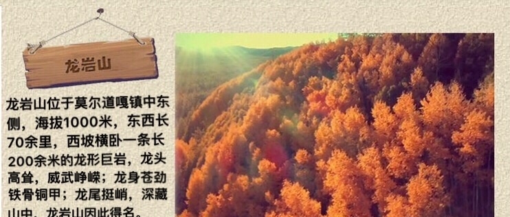 8、莫尔道嘎国家森林公园:莫尔道嘎森林公园,是国家林业局批准建立的内蒙古大兴安岭首家国家森林公园,也是最具有寒温带特色的森林公园。 内蒙古莫尔道嘎国家森林公园是大兴安岭观赏红叶的最佳地点,它是我国最后一片寒温带原始森林,兼有草原道大兴安岭西北坡过渡带的地质地貌景观,其原始林区素有"落叶松故乡"之称,树种以落叶松为主,其次为白桦,故秋色以橘红和黄色为主。 地理位置优越,南邻大草原,北接中俄界河,山峦起伏,古木参天,植被丰富,溪流密布,处处展现幽、野、秀、新的风采,以其林海、松风、蓝天、白云的夏季风光和冰峰、雪岭、严寒、雾凇的冬季风韵、为人们提供清凉避暑、休闲度假、生态考察和体验寒冷、挑战极限、体味人生的理想境地。公园的宣传口号是"南有西双版北有莫尔道嘎"。公园森林风景资源独具北国特色,保存着我国最后一片寒温带明亮针叶原始林景观,且地理位置优越,南邻大草原,北接中俄界河,山峦起伏,古木参天,植被丰富,溪流密布,处处展现幽、野、秀、新的风采,以其林海、松风、蓝天、白云的夏季风光和冰峰、雪岭、严寒、雾凇的冬季风韵、为人们提供清凉避暑、休闲度假、生态考察和体验寒冷、挑战极限、体味人生的理想境地。龙岩山位于莫尔道嘎镇中东侧,海拔1000米,东西长70余里,西坡横卧一条长200余米的龙形巨岩,龙头高耸,威武峥嵘;龙身苍劲,铁骨铜甲;龙尾挺峭,深藏山中,龙岩山因此而得名。内蒙古龙岩山上天然林生长茂密,樟子松、落叶松、白桦、山杨等兴安主要树种应有尽有;杜鹃、刺莓、百合、柳兰等各类花卉草药比比皆是。山前建有游人登山甬道,山后建有车辆盘山公路,游人登临,不论是步行还是坐车,穿行于绿色廊道之中均会感悟到大兴安岭的幽野新奇。龙岩山风光旖旎。春天,寒雪初融,达子香顶雪开放,如胭似霞,红遍山谷;秋天,霜染叶红,林海风卷浪涌,云清气爽,满山斑斓;冬天,大雪纷飞,山林裹纱铺絮,雾淞满枝,晶莹剔透。胜景之最当数夏季,届时花木繁茂,鸟语花香,特别是雨过初晴,清晨登上山顶,山下,秀美的林城炊烟袅袅,宁静安逸;山上,薄雾朦胧。待到朝霞乍露,淡粉色的云霞在森林间升腾,如果幸运则可见东方天际霞光四射,显现出佛光闪烁,好一派吉祥气象。在龙岩山上建有一座占地2500平方米的成吉思汗公园。大汗凭吊已成为到莫尔道嘎国家森林公园旅游必到的一处景点。成吉思汗公园内,四周竖立着各色狼牙军旗,迎风招展。18米高的大汗戎装跃马、拉弓射雕的巨型雕像矗立其中。雕像旁,蒙古式的点将亭台威严肃穆,两侧刀、枪、矛、叉等古兵器分架排列。在"上马石"、"饮马坑"和隐匿于树林边的犴、鹿、熊等动物雕塑小品的衬托下,整个公园展现着一种气吞山河的英雄气概。巨型雕塑的基座上,镌刻有颂扬大汗伟绩的"大汗祭"文。相传成吉思汗回祭祖,之后提骑五百游猎于此,登上龙岩山,但见山明水秀,祥瑞之光在林间升起,盘桓山头,流连忘返。忽一大雕自云头冲下,大汗提缰纵马,拉弓搭箭,弦响镝鸣,巨雕扑地。久有统一蒙古大志的铁木真,射雕发威,大吼一声莫尔道嘎(蒙古语意为上马出征),遂挥师西进,旗猎猎、马萧萧、征西辽、攻西夏、灭畏兀,终成大业.游人至此,无不驻足伟人马前,观大汗雄姿,缅先人伟业,激发奋进豪情。"红豆坡"位于莫尔道嘎国家森林公园9公里处,因山坡长满越桔(兴安红豆)而得名。红豆坡是大兴安岭林区典型的杜香林林型,且是纯中龄落叶清塘林,植被自上而下,层次清晰。景区内,40--80年生中龄落叶松天然林疏密均匀,树干笔直,树冠葱茏,犹如人工修剪过一般。林地上长满红豆,褐茎绿叶,白花红果。红豆植株的上面,与其相伴而生着茂密的散发着香水般气味的杜香。游人步入红豆坡内,满目苍翠,清香扑鼻,采一把红豆酸甜可口;撸几片杜香叶,用手搓一搓,胜过喷酒香水。唐代诗人王维有《相思》篇,使南国红豆"此物最相思",演绎出一段动人的爱情故事。但在塞北大兴安岭,以清松为盖、杜香为伴、红豆可食的生态现象,作为南国红豆故事的续篇,也引发出一段"北国红豆也相思"的感人传说。堰松幽径,位于莫尔道嘎森林公园内12公里处,占地1900多公顷,因偃松罕见的面积大、密度高,被科考的生态专家称为"兴安奇景"。偃松,即马尾松、五针松,是大兴安岭高山岩石缝中生长的常绿灌木。枝干婉蜒曲折,长约10米,叶五针一束,淡黄色,紫红色球形花蕊,显现其雌雄同株特性,人们常将偃松作为观赏植物栽于庭院或盆中。沿堰松林小径攀山,山上纤细的堰松枝叶苍翠欲滴、松香袭人。每当果实成熟,采一筐偃松籽,或煎或炒,香酥可口。鹿道,位于莫尔道嘎国家森林公园14公里处,因有一条狍鹿下山喝水踩出的小道而得名。鹿道上下各有一株距今300年以上的高大樟子松,树干粗大奇特,在森林里大有鹤立鸡群之感,上下遥相呼应。坡下的树上长有状如钱币的巨大圆形松包,被称作"摇钱树";坡上的树先被雷击而枯,后又因雷击而活,且生长得特别茂盛,被称作"大寿松"。当地山民有这样的习俗,对着山峰摆上祭品,摸一摸摇钱树,拜一拜大寿树,会人财两旺。游人可重温山民旧俗,祈祷自身吉祥如意。一目九岭,地处莫尔道嘎国家森林公园16公里处的山巅之上。登观景台极目远眺,大兴安岭的深邃与辽阔尽收眼底。在此观山,但见山连山,岭连岭;山外有山,岭外有岭。屈指数去,九
