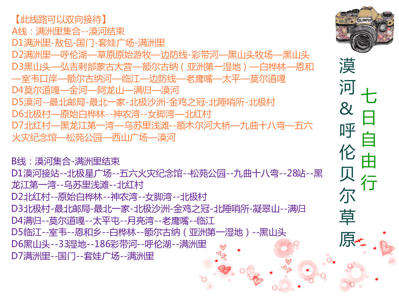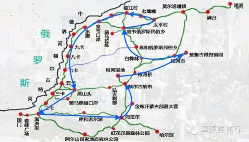 旅游推荐经典路线:3日游:第一天:——黑山头(住宿蒙古包)(途经景点:金帐汗、莫日格勒河腹地也称天下第一曲水、穿越大草原、深入草原腹地感受原生态草原、哈吉鄂温克民族乡、湿地也称亚洲第一湿地、弘吉剌布蒙古大营、黑山头观日落);第二天:黑山头——(住)(途经景点:黑山头中俄口岸、八大关、186彩带河、三十三湿地、最辽阔的草原、胡列也吐、猛犸博物馆、夜景、中苏街);(骑马、射箭、滑草、访牧户等各种草原娱乐项目)。(骑马、射箭、滑草、访牧户等各种草原娱乐项目)。第三天:——(结束)(途经景点:国门、41号界碑、套娃广场、呼伦湖、呼和诺尔景区)4日游:第一天:——恩和(住宿俄罗斯式木屋)(途经景点:金帐汗、莫日格勒河腹地也称天下第一曲水、穿越大草原、感受原生态草原,哈吉鄂温克民族乡、湿地也称亚洲第一湿地、白桦林、百年老屋、恩和俄罗斯民乡);第二天:恩和—边境卡线—黑山头(住宿蒙古包)(途经景点:界河风光、七卡、六卡、五卡—乌兰山太极图—黑山头古城);(骑马、射箭、滑草、访牧户等各种草原娱乐项目)。第三天:黑山头——(住)(途经景点:黑山头中俄口岸、八大关、186彩带河、三十三湿地、最辽阔的草原、胡列也吐、猛犸博物馆、夜景、中苏街)。第四天:——(结束)(途经景点:国门、41号界碑、套娃广场、呼伦湖、呼和诺尔景区)5日游:第一天:—(住)(途经景点:金帐汗、莫日格勒河腹地也称天下第一曲水、穿越大草原、感受原生态草原,哈吉鄂温克民族乡、湿地也称亚洲第一湿地)。第二天:—恩和——临江(住宿俄罗斯式木屋)(途经景点:白桦林、百年老屋、恩和俄罗斯民俗馆、哈乌尔河景区、界河对面的俄罗斯村落、全国十大魅力名镇、蒙古族发源地、原生态临江屯、观日落)。第三天:临江—边境卡线—黑山头(住宿蒙古包)(途经景点:口岸、中俄友谊桥、河两岸自然风光、九卡、八卡、七卡、六卡、五卡—乌兰山太极图—黑山头古城);(骑马、射箭、滑草、访牧户等各种草原娱乐项目)。第四天:黑山头—(住)(途经景点:黑山头中俄口岸、八大关、186彩带河、三十三湿地、最辽阔的草原、胡列也吐、猛犸博物馆、夜景、中苏街)。第五天:——(结束)(途经景点:国门、41号界碑、套娃广场、呼伦湖、呼和诺尔景区)6日游:第一天:—(住)(途经景点:金帐汗、莫日格勒河腹地也称天下第一曲水、穿越大草原、感受原生态草原,哈吉鄂温克民族乡、湿地也称亚洲第一湿地)。第二天:—敖鲁古雅使鹿部落—得耳布尔—莫尔道嘎(住)第三天:莫尔道嘎——太平屯——临江(住宿俄罗斯式木屋)(途经景点:莫尔道嘎国家森林公园、太平村、月牙泡、、老鹰嘴、临江原生态屯)。第四天:临江—边境卡线—黑山头(住宿蒙古包)(途经景点:口岸、中俄友谊桥、河两岸自然风光、九卡、八卡、七卡、六卡、五卡—乌兰山太极图—黑山头古城);(骑马、射箭、滑草、访牧户等各种草原娱乐项目)。第五天:黑山头—(住)(途经景点:黑山头中俄口岸、八大关、186彩带河、三十三湿地、最辽阔的草原、胡列也吐、猛犸博物馆、夜景、中苏街)。第六天:——(结束)(途经景点:国门、41号界碑、套娃广场、呼伦湖、呼和诺尔景区)7日游经典北线+满归路线:第一天:—(住)(途经景点:金帐汗、莫日格勒河腹地也称天下第一曲水、穿越大草原、感受原生态草原,哈吉鄂温克民族乡、湿地也称亚洲第一湿地)。第二天:——金河—满归(住)(途经景点:敖鲁古雅驯鹿园、冷极村、金河、伊克萨玛公园、脚印湖、九头山)。第三天:满归—金河—莫尔道嘎(住)(途经景点:兴安树王、凝翠山、龙岩山、大兴安岭原始森林)。第四天:莫尔道嘎——太平屯——临江(住宿俄罗斯式木屋)(途经景点:莫尔道嘎国家森林公园、太平村、月牙泡、、老鹰嘴、临江原生态屯)。第五天:临江—边境卡线—黑山头(住宿蒙古包)(途经景点:口岸、中俄友谊桥、河两岸自然风光、九卡、八卡、七卡、六卡、五卡—乌兰山太极图—黑山头古城);(骑马、射箭、滑草、访牧户等各种草原娱乐项目)。第六天:黑山头—(住)(途经景点:黑山头中俄口岸、八大关、186彩带河、三十三湿地、最辽阔的草原、胡列也吐、猛犸博物馆、夜景、中苏街)。第七天:——(结束)(途经景点:国门、41号界碑、套娃广场、呼伦湖、呼和诺尔景区)7日游经典北线+阿尔山路线:第一天:—(住)(途经景点:金帐汗、莫日格勒河腹地也称天下第一曲水、穿越大草原、感受原生态草原,哈吉鄂温克民族乡、湿地也称亚洲第一湿地)。第二天:—恩和——临江(住宿俄罗斯式木屋)(途经景点:白桦林、百年老屋、恩和俄罗斯民俗馆、哈乌尔河景区、界河对面的俄罗斯村落、全国十大魅力名镇、蒙古族发源地、原生态临江屯、观日落)。第三天:临江—边境卡线—黑山头(住宿蒙古包)(途经景点:口岸、中俄友谊桥、河两岸自然风光、九卡、八卡、七卡、六卡、五卡—乌兰山太极图—黑山头古城);(骑马、射箭、滑草、访牧户等各种草原娱乐项目)。第四天:黑山头—(住)(途经景点:黑山头中俄口岸、八大关、186彩带河、三十三湿地、最辽阔的草原、胡列也吐、猛犸博物馆、夜景、中苏街)。第五天:——甘珠尔庙—诺门罕战争遗址--—伊尔施—阿尔山天池第六天:阿尔山森林公园(住)(参观中国第三大天池——阿尔山天池,以植物多样性著称的亚洲