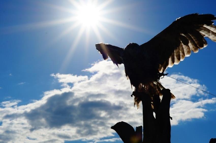 就是喜欢这棵树,其貌不扬的一棵树…… 在一个小山顶有自己的一方小天地 没有悲伤的姿态 一半在尘土里安详,一半在风里飞扬 非常沉默,非常骄傲 从不依靠,从不寻找 …… 当我在山顶看到你,蓝天白云下迎风飞扬的你,脑中就是这首三毛的诗 如果有来生,愿做一棵树 把一瞬站成永恒…… 这是山顶供人拍照的鹰,张开翅膀身后依然有线拉扯……