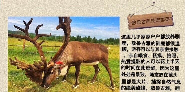 ★俄风山庄始建于 2011 年,在这里有大面积的玫瑰花园,百合园、树莓,黑加仑,沙棘水果园、在这里可体验自己动手做果酱、可以体验自己采摘蔬菜烹饪美食、还可以和庄主协议认购属于自己的果树、秋收季节就可以吃到自己果树的果实了、★敖鲁古雅,体验亲手喂驯鹿(四不像),一个200多人的群体,一群1000只出头的驯鹿,一个从原始社会直接过渡到现在社会,却依然在传统与现代的夹缝中徘徊的部落,这里是驯鹿的故乡,中国最后一个狩猎部落,中国唯一的使鹿部落,驯鹿文化