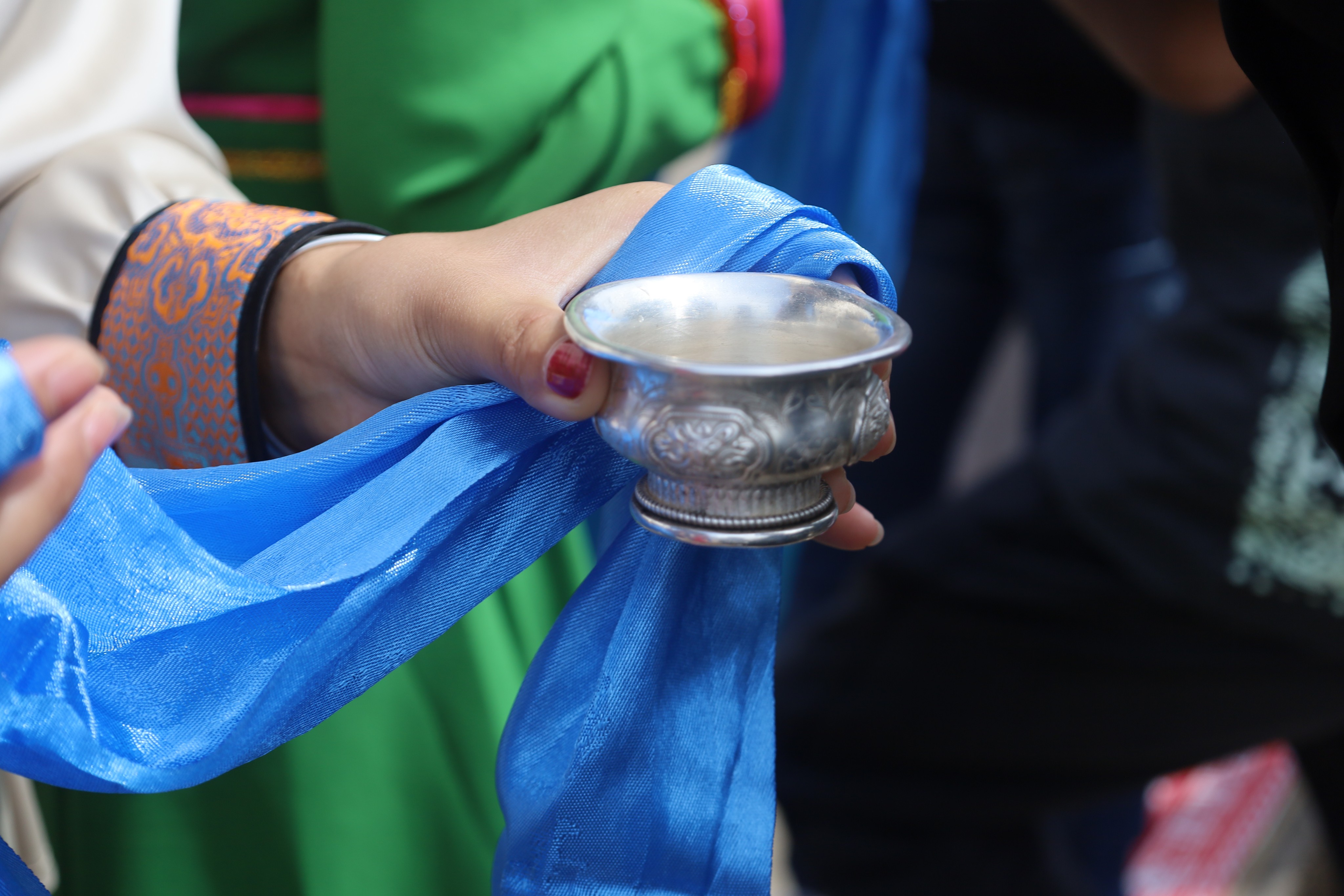 哈达的由来及使用:千百年来,逐水草游牧的蒙古民族在日常生活中,拥有广泛使用哈达的高尚习俗,是地地道道蓝色文明的象征。蒙古民族正宗的哈达为什么是蓝色的哈达?这与其民族宗教信仰分不开。自远古时期开始,蒙古民族始终崇拜大自然-信奉长生天,认为苍穹的颜色浩瀚无边、纯洁美丽、清新永恒,以威猛的神力呵护着草原上的万物生灵。为此,蒙古民族无比敬慕苍天之蓝色。甚至为了达到人与大自然完美和谐统一,蒙古民族男性身着与苍天相谐的蓝色服装;女性身着与大地相谐的绿色衣裳牗随着年龄的变化,服装的颜色由浅变深牘。由此,形成了强烈的生态意识和道德观:衡量一个人的品质、分析事物发展的原委、决策任何事情,总是以生态道德理念为尺度,来护卫大自然的原始状态,将赖以生存的绿色植被珍爱如命。所以,他们自豪地把自己称之为“蓝色民族”。此后,藏族开始使用象征雪域高原特色的白色哈达。后来,随着藏传佛教在蒙古地区的全面渗透,白色哈达牗蒙语称为散拜牘和黄色哈达也随之出现在蒙古草原。但是,因为几种哈达的使命和寓意不同,在使用方面有着根本的区别,白色哈达仅限于在丧葬场合使用,黄色哈达只是拜佛时使用,这两种外来的哈达无法取代固有的蓝色哈达。蒙古民族的蓝色哈达不仅象征纯洁神圣、清新永恒的苍穹本色及力量,还意味着淳朴善良、美好吉祥等丰富多彩的情感寓意。同样的哈达在不同的场合,体现着不同的情感价值。在过去,凡是成年男女都要随身携带哈达,准备随时使用,会客、拜见、祝寿、婚宴、送礼等诸多生活场面都离不开哈达。征兆万事吉祥、美好如意的蓝色哈达被珍视为“礼仪之首”。在各种喜庆场合,富人馈赠一头牛,穷人只赠送一条哈达,没有尊卑之别,在礼节上一视同仁。在日常生活中,蒙古民族使用哈达的礼节随处可见。在家中会客、野外路遇、探亲访友、求人办事双方一见面,为了表达和善友好、互相尊重和祝福之情,彼此先从腰间的褡裢里取出哈达来,进行对接、交换鼻烟壶行请安之礼,然后再谈正事。若因疏忽大意没带哈达,在途中或牧场遇见陌生人,为了消除不愉快和疑虑,下马之后应急用马缰或者展开腰带的一端,来代替昭示深情吉祥的哈达,与对方行见面礼,表示善良诚挚之情。在祭祀场合奉献哈达,是表示对信仰的虔诚,期盼祈祷的夙愿能够如愿以偿;迁到新的牧场搭起毡帐后,要往天窗缆绳上系一条哈达,意在安抚四面八方的神灵,祈盼保佑;对放生封神的马匹或其它牲畜,在其鬃毛或犄角上盘系哈达,意在祝愿它远离邪恶,好运常在。