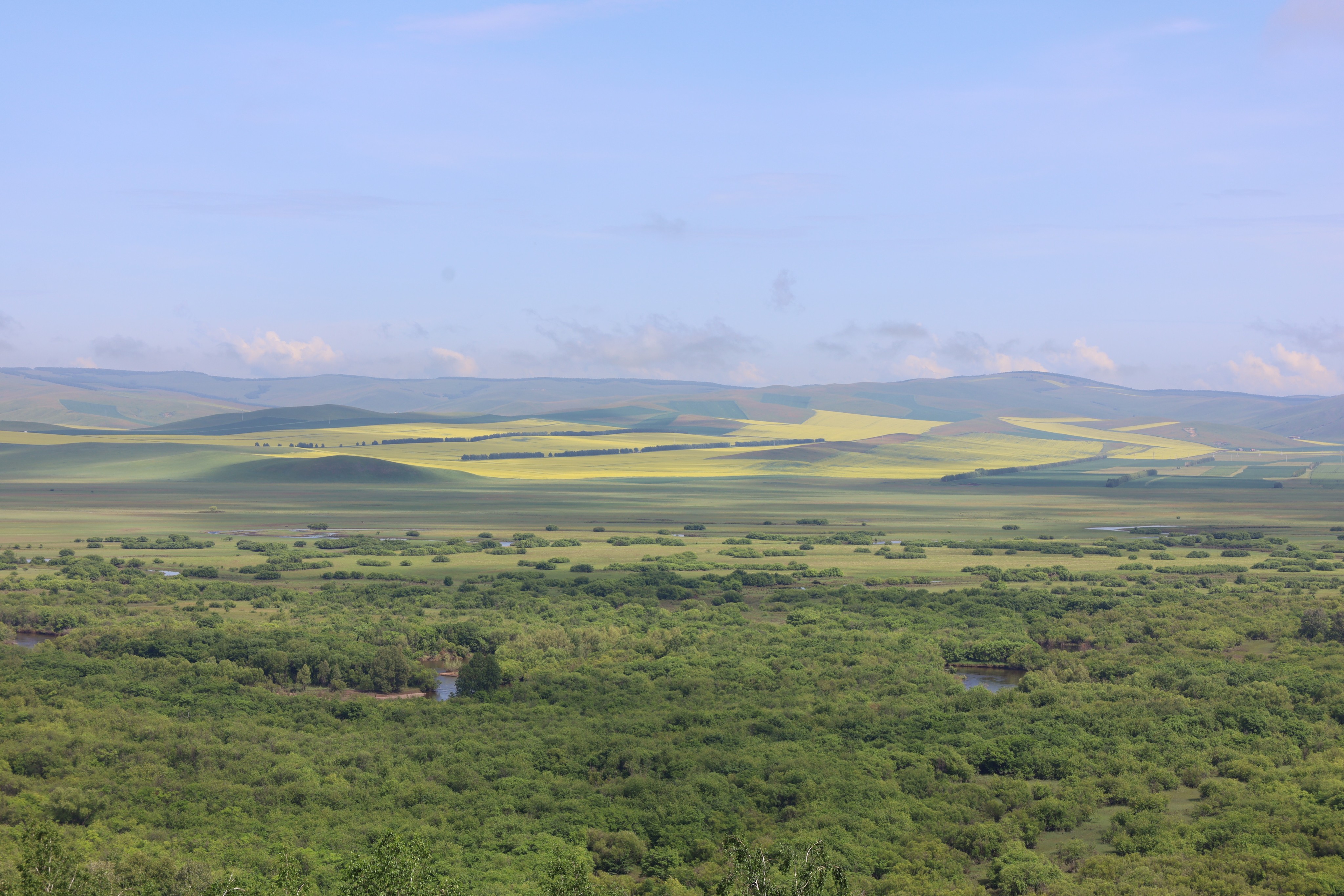 (11)乡位于市的西北面,四面环山,周围多是山丘,草场和白桦林交汇生长,层次分明。距离10公里左右的正阳,朝阳,向阳等村的油菜花田很美。在花丛中扬起你手中的丝巾,拍一张美美的照片。(12)黑山头值得看的风景就是去边界河畔观看日落。黑山头向五卡方向行驶3公里路左侧有一块湿地,湿地上稀疏的几丛树木,怡然吃草的牛羊,在蓝天白云的映射下很美的一幅画卷。