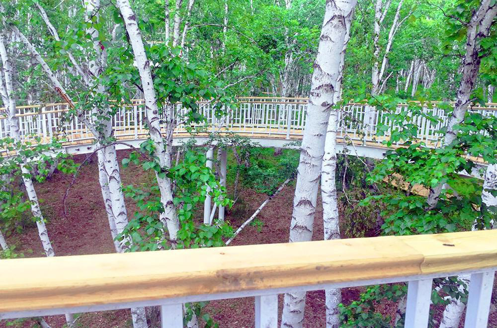 花海之后来到了白桦林景区,阳光透过树叶斑斑驳驳,树干洁白,疏影横斜,栈道弯曲前行,我们涉足而上