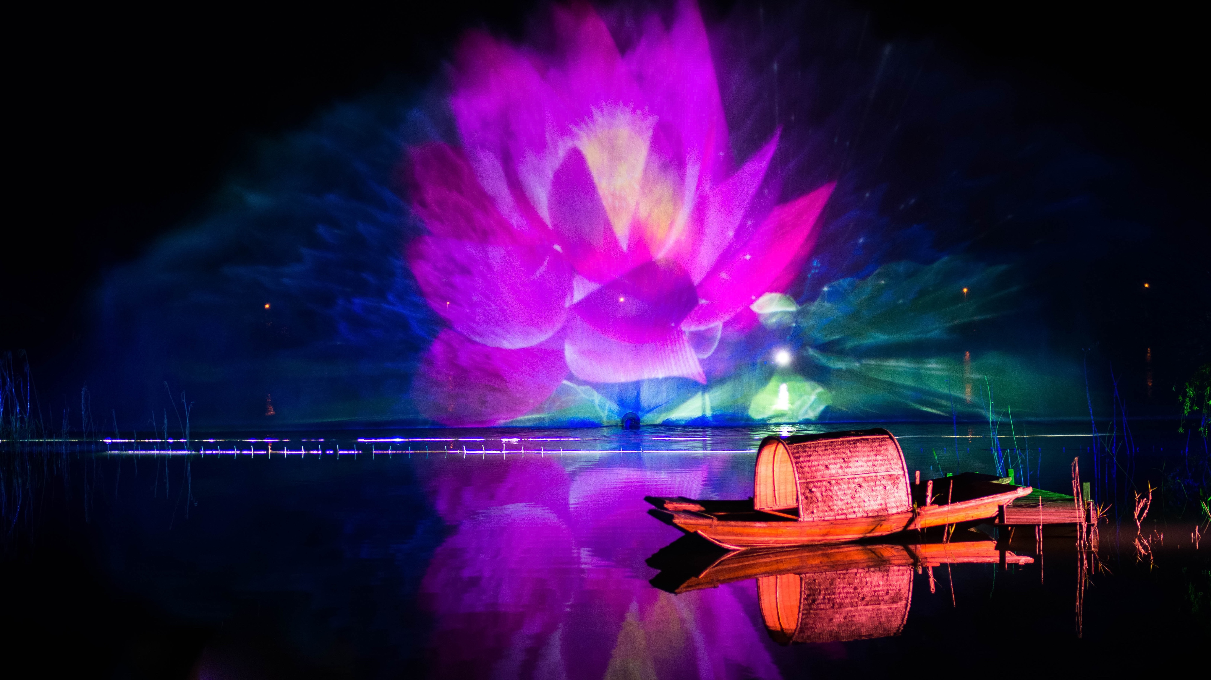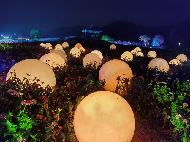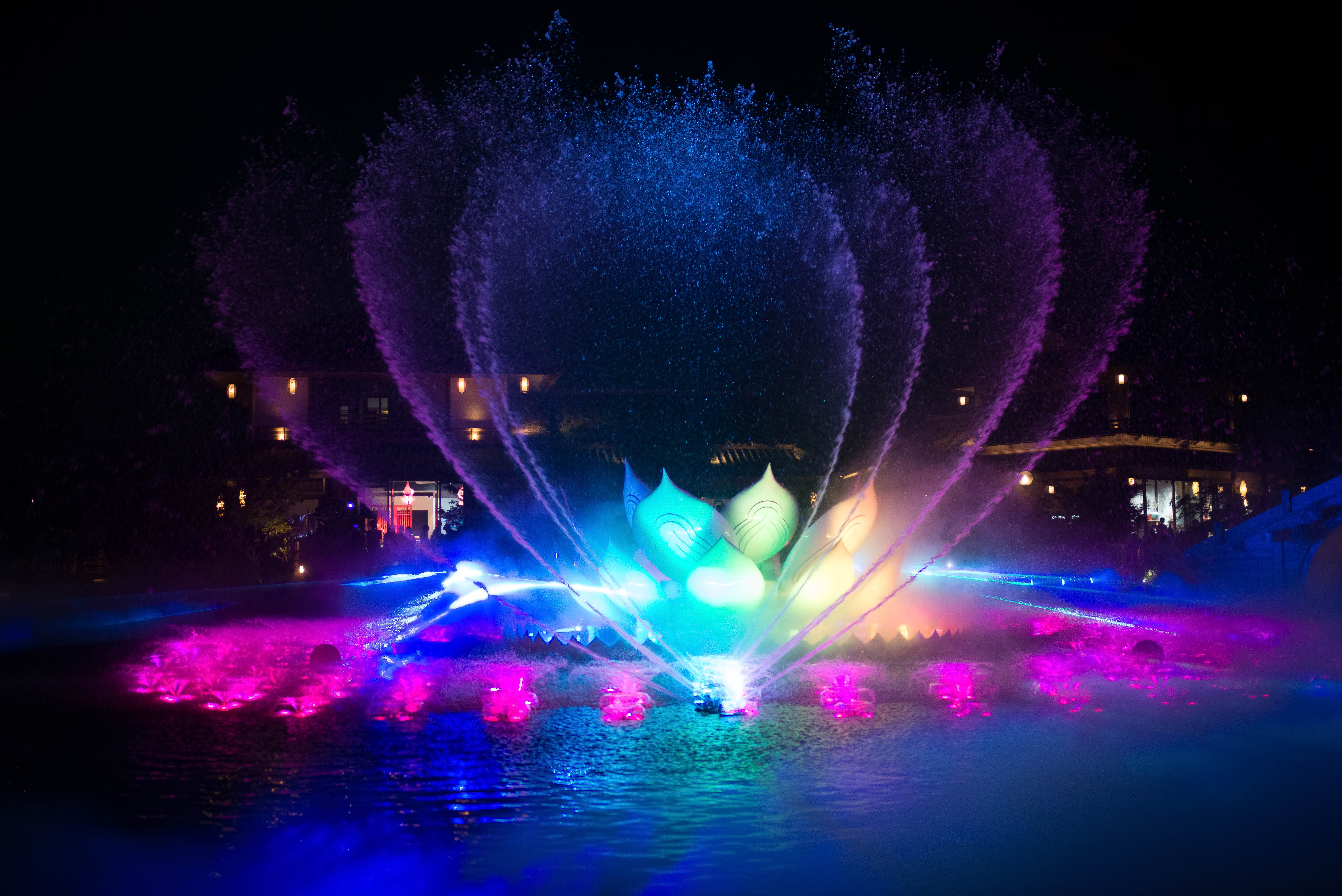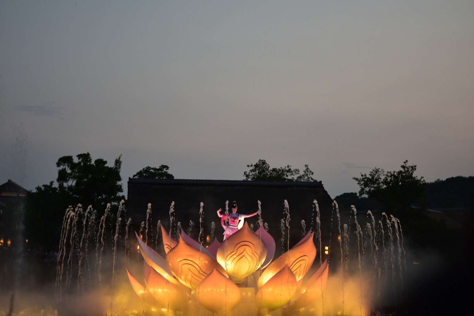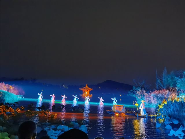 夜晚看灯光秀,在空旷的山谷里,月亮的清辉下,在王菲空灵缥缈的歌声中看舞者翩翩起舞,感受莲叶田田,虫鸣啾啾,凉风习习,月儿圆圆.......很有意境。