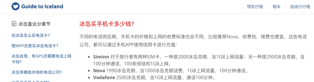 可以看我的游记写的非常详细。当时考虑了几种方案,租wifi、电话卡、中国移动全球流量等。翻看一些资料,欧洲大陆中国移动的全球流量还可以,冰岛毕竟属于边缘,不太放心所以放弃;租wifi感觉一个是贵一些,还有拿着不方便也要单充电,移动路由器普遍要比手机信号差一些,放弃;经过查找大量资料,后来经过实...显示全部