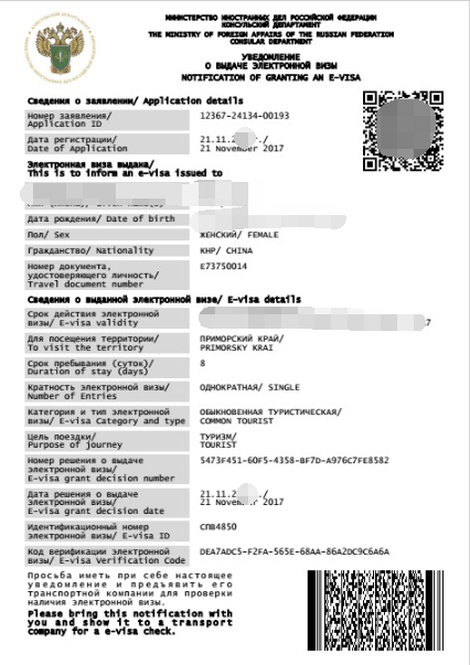 海参崴属于俄罗斯滨海边疆区,目前,中国公民前往滨海边疆区可以申请电子签证,只需在网站上输入简单的护照信息,并上传一张照片即可,无需费用。申请网址:https://visaonline.kdmid.ru/(有中文页面) 我申请后大概第四天就收到了邮件。签证有效期大约一个月,是从签发日期开始生效,...显示全部