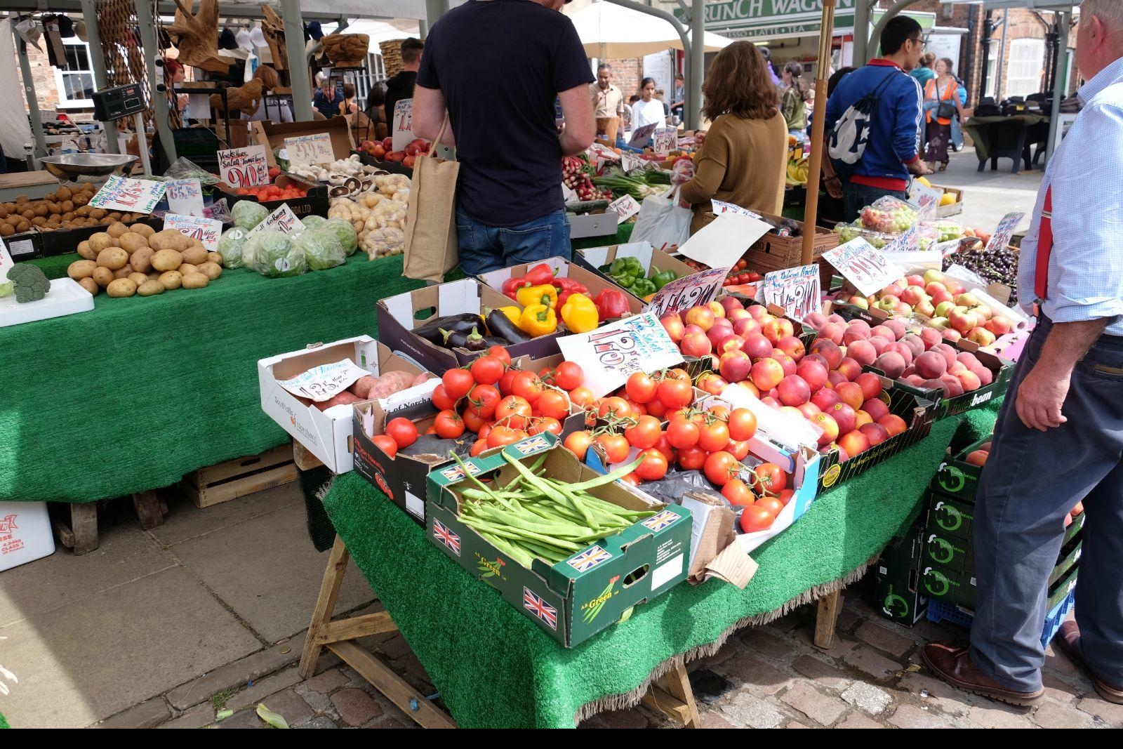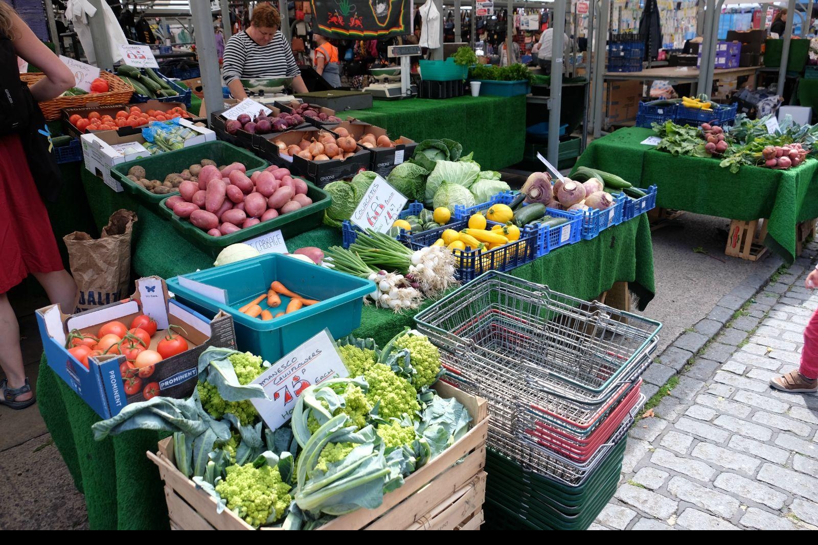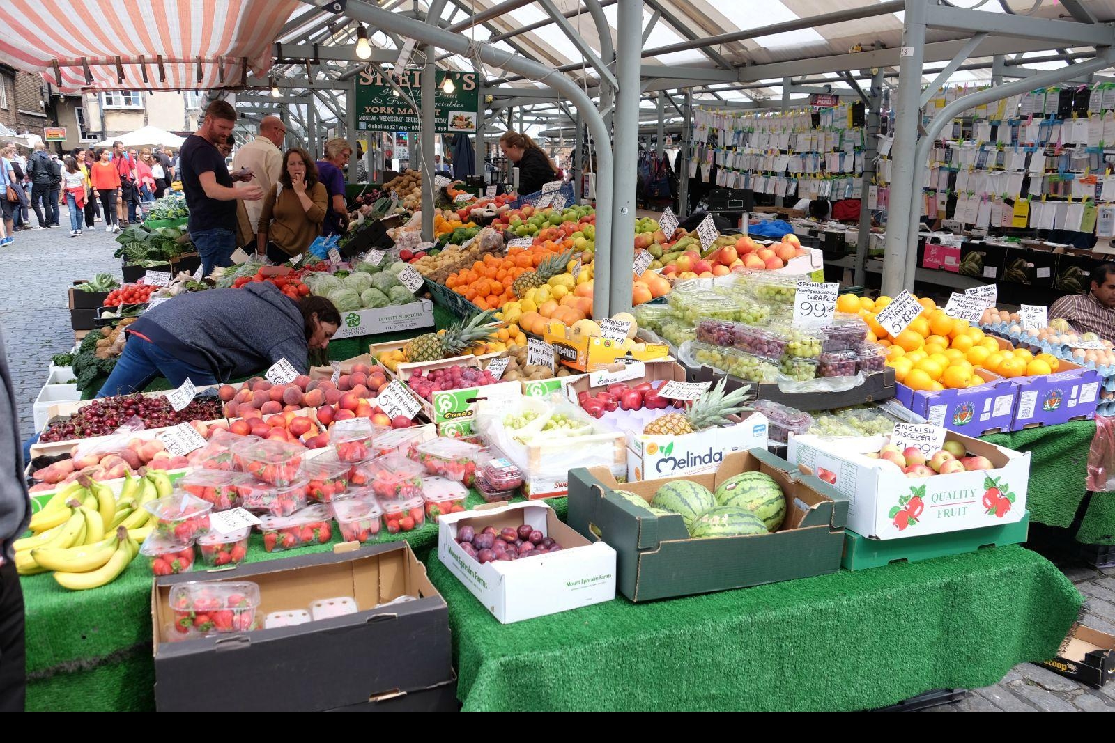 肉铺街集市,地处城中心,其历史可以追溯到公元700年的萨克逊时期。市场规模不算大,占满了肉铺街后面的小广场,蔬菜水果、肉食水产、奶酪制品、工艺品、小商品、园艺装饰、服装服饰、图书海报,还有必不可少的餐饮摊,也算是应有尽有。